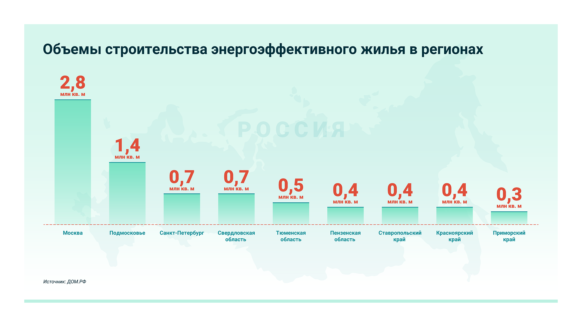 Как отмечают эксперты «ДОМ.РФ», увеличение объемов строительства энергоэффективного жилья в регионах тесно связано с внедрением зеленых национальных стандартов и с финансовым стимулированием. Например, в Свердловской области благодаря участию региона в кластерной программе построено два энергоэффективных многоквартирных дома.
