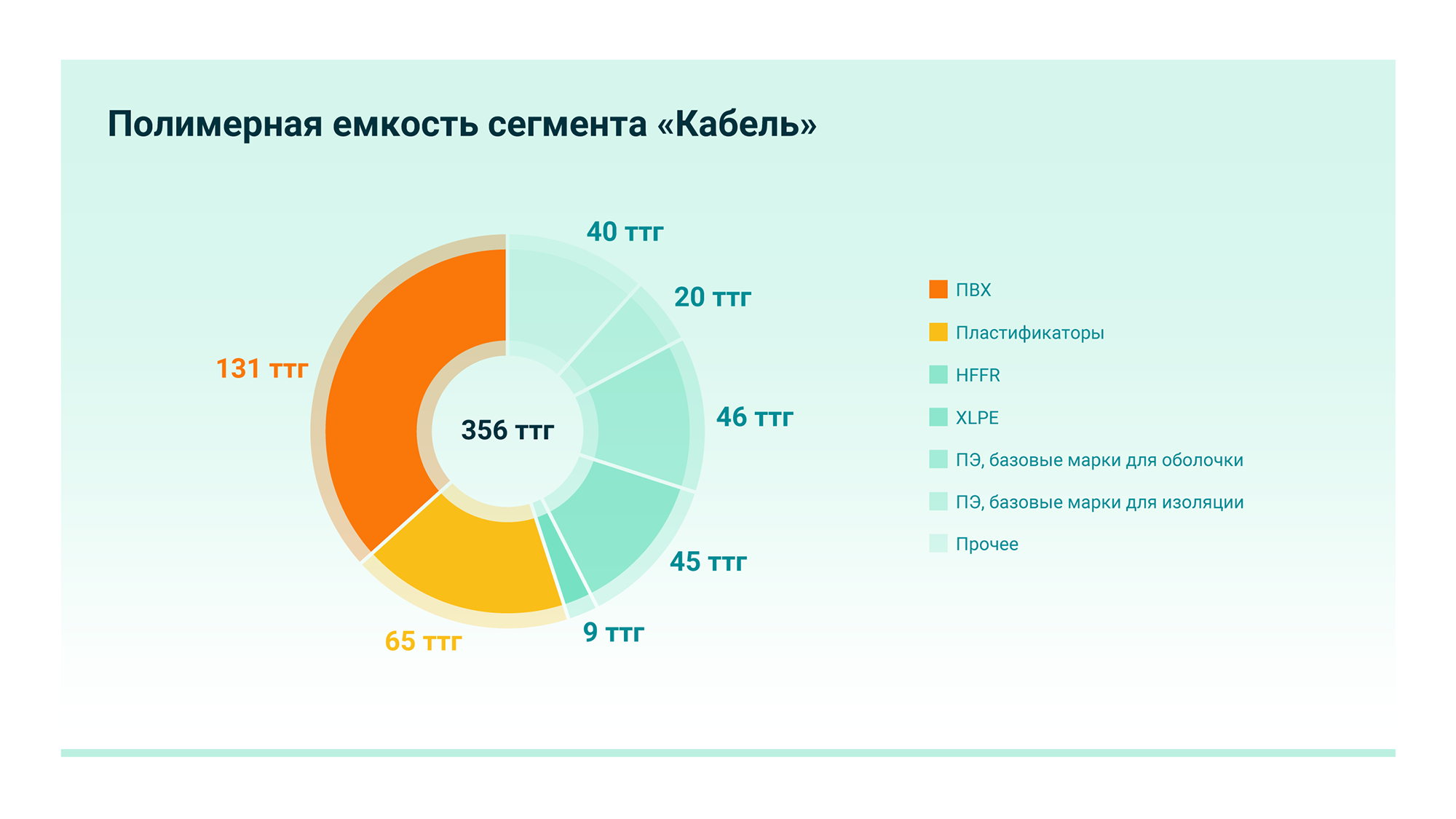 Производство полимерных изоляционных материалов зависит от состояния и требований кабельного рынка. В себестоимости кабелей доля полимеров невысока, однако полимерные оболочка и изоляция являются критически важными элементами конструкции кабеля, обеспечивающими его безопасную и эффективную работу. Современные кабельные оболочки, в зависимости от назначения и среды прокладки, изготавливаются из различных полимеров. Полиолефиновые компаунды стали одним из основных материалов для производства кабельной изоляции. Так, около 10% всего производимого в мире полиэтилена (примерно 5 млн тонн в год) используется для их создания.