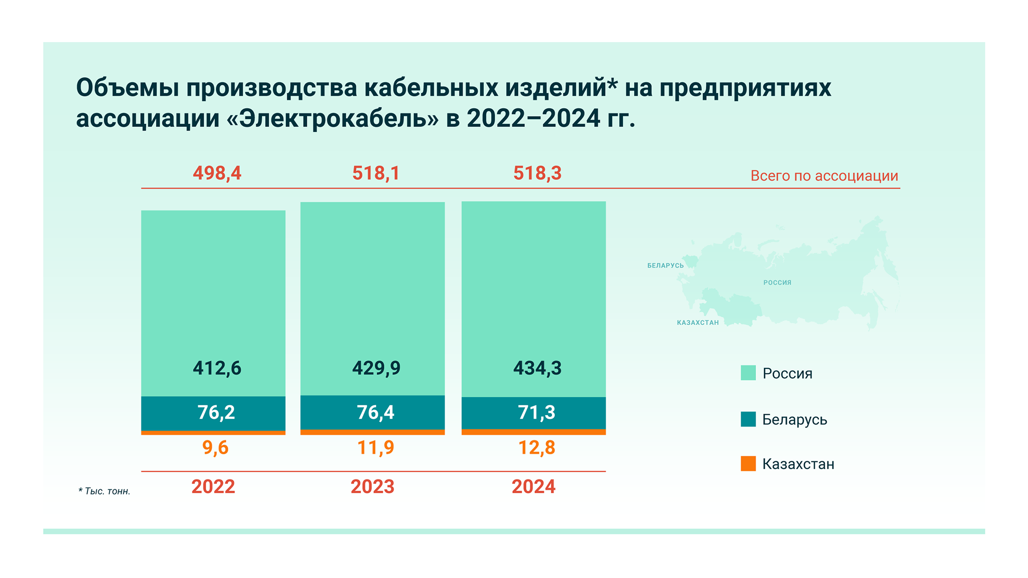 В России насчитывается порядка 200 кабельных заводов. Крупнейшее в СНГ отраслевое объединение — ассоциация «Электрокабель» — консолидирует ключевые предприятия отрасли, чей совокупный объем выпуска кабельно-проводниковой продукции, производимой в нашей стране, составляет более 75%. Ассоциация выступает площадкой, объединяющей общеотраслевые интересы и формирующей политику отрасли.