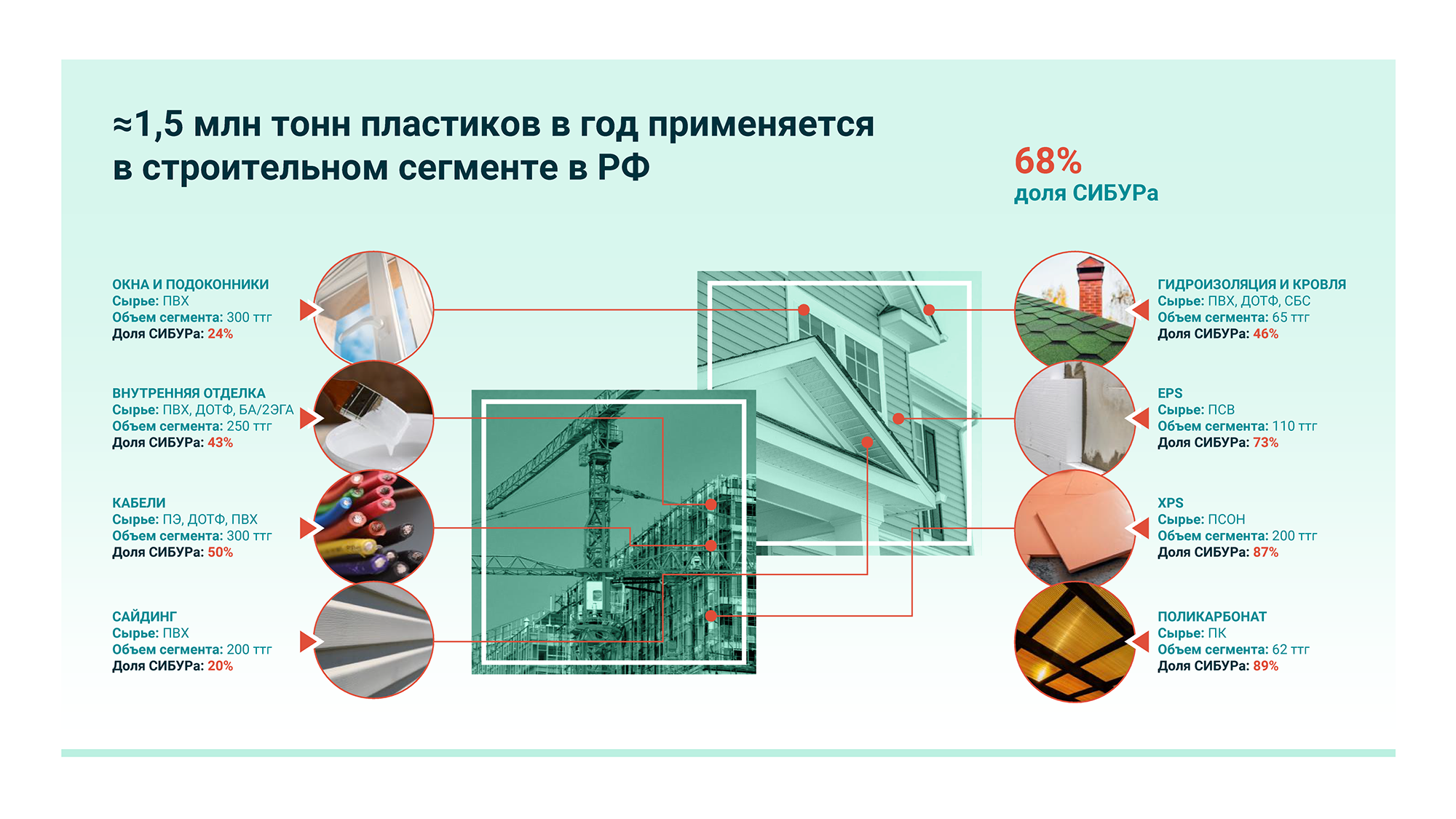 Строительная индустрия потребляет 21% всех полимеров в мире, занимая по этому показателю второе место после индустрии упаковки. В России годовая потребность отрасли во всех видах стройматериалов превышает 100 млн тонн, но доля полимеров в объеме стройматериалов относительно мала: примерно вдвое меньше, чем в Европе. В стране ежегодно потребляется около 1,5 млн тонн полимерных стройматериалов в пересчете на сырье, а доля СИБУРа в этом объеме превышает 68%.