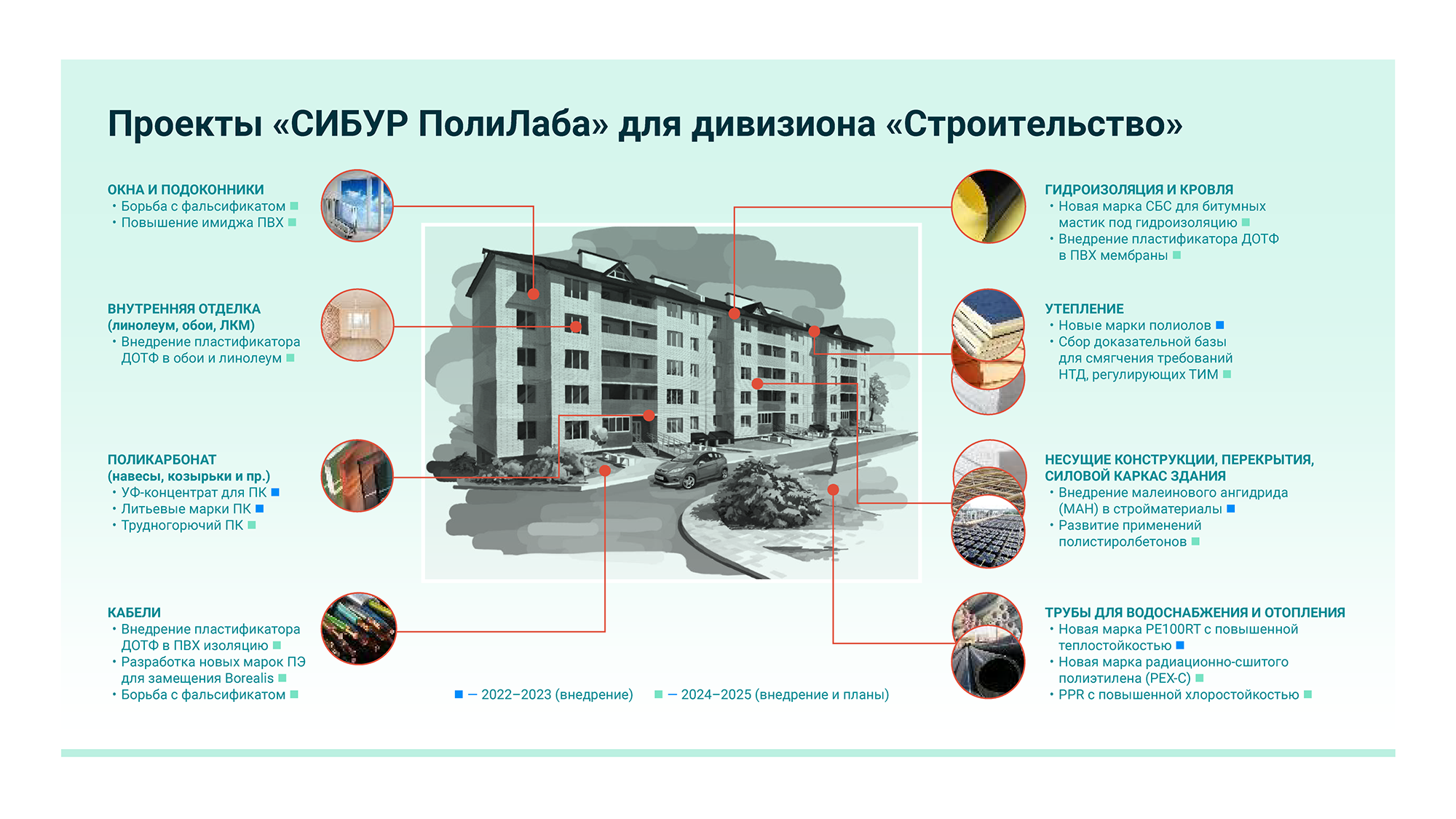 Только за 2022–2023 годы специалисты «ПолиЛаба» реализовали пять актуальных проектов для строительной отрасли. Среди них: УФ-концентрат для поликарбонатов, литьевые марки поликарбонатов и новые марки полиолов для утеплителей. До конца 2025 года будут реализованы еще 13 проектов.