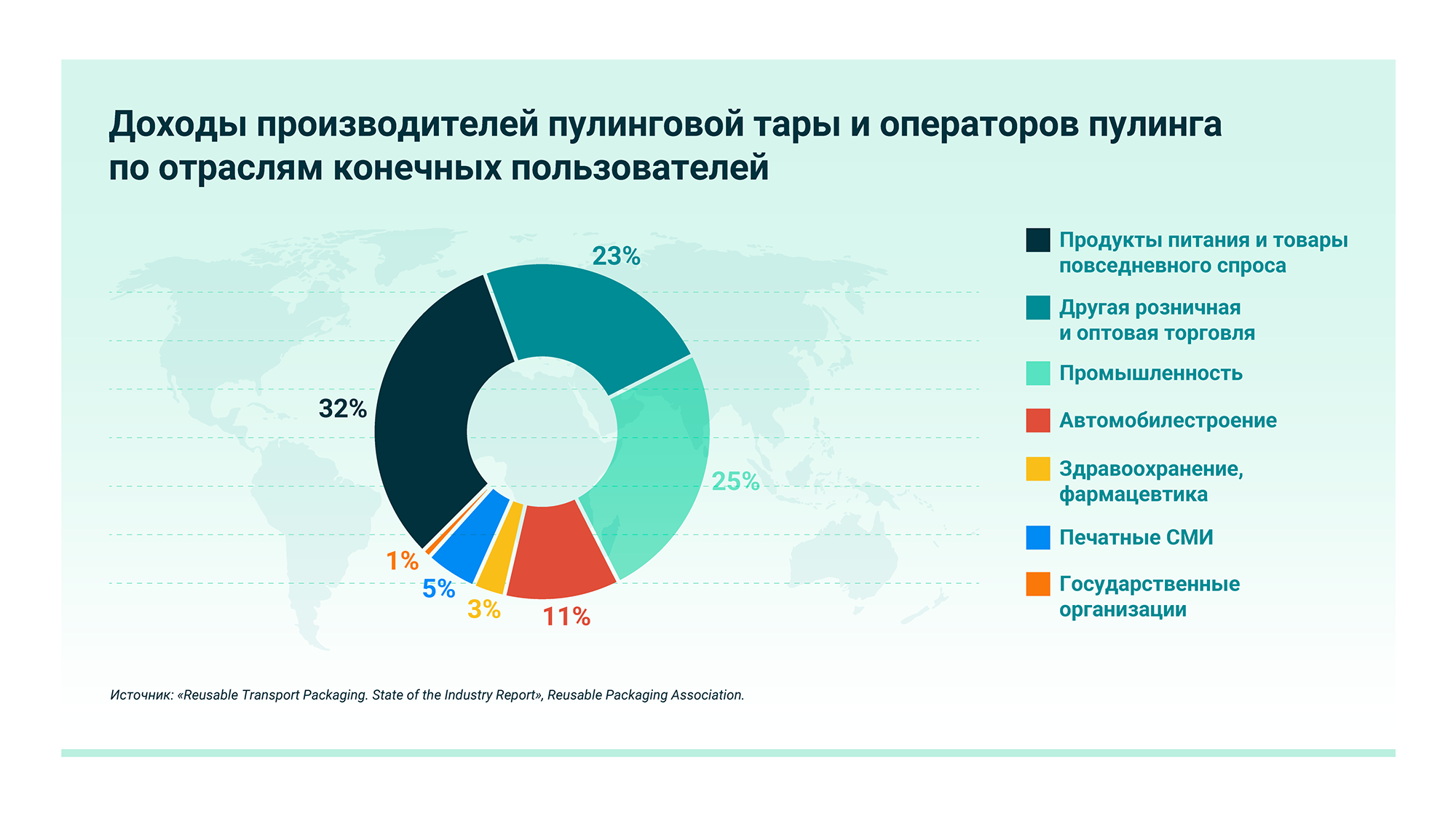Оборотная тара широко используется во многих отраслях. Динамика их развития определяет требования к этой категории упаковки. Список отраслей-драйверов рынка многооборотной тары примерно одинаков для большинства стран. Так, около 32% всего мирового парка возвратной тары задействовано в логистических схемах оборота потребительских товаров, в торговле другими товарами – 23%, в промышленном секторе – 25%. Ощутимо влияют на тренды логистики и такие взыскательные потребители многооборотной тары, как участники авторынка (11%), а также производители и продавцы медицинских препаратов (3%).