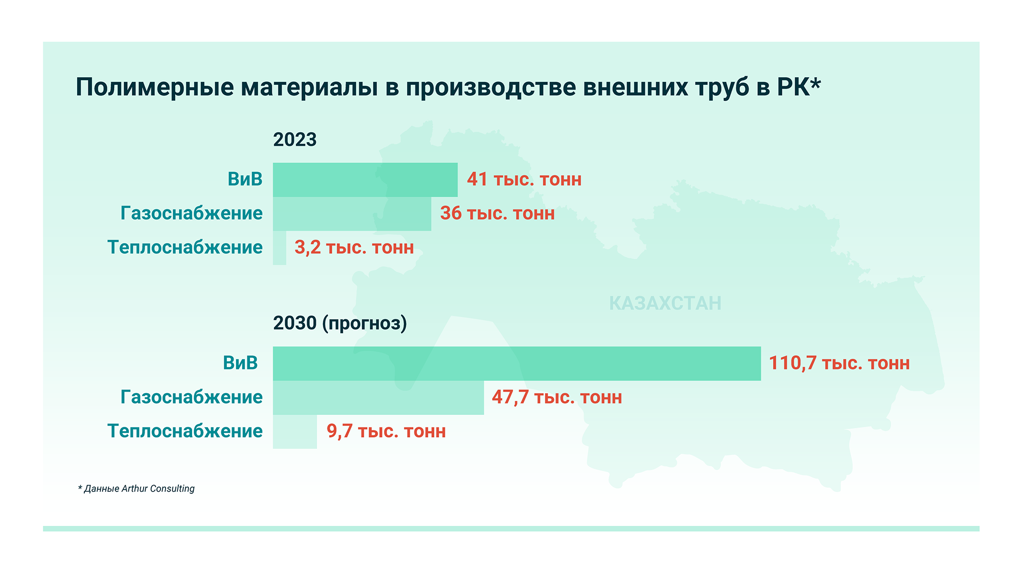 - По мнению экспертов, в Казахстане есть потенциал для более чем двукратного роста спроса на внешние полимерные трубопроводы – с 81 тыс. тонн в 2023-м до 168 тыс. тонн в 2030-м. Среди всех материалов наибольший потенциал – у трубных марок полиэтилена.