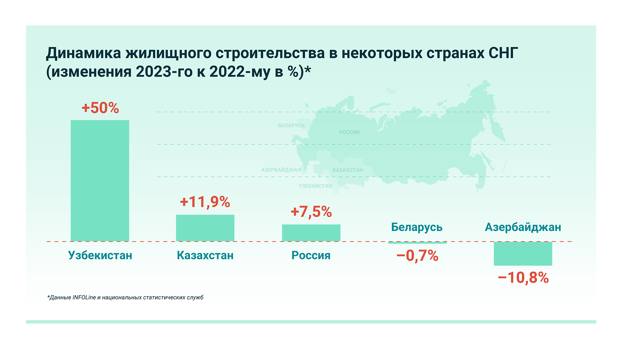 Успехи в развитии жилищного строительства видны в сравнении с соседями. В 2023-м на каждого казахстанца пришлось 0,88 кв. м новой площади, тогда как в России – 0,76 кв. м на человека.