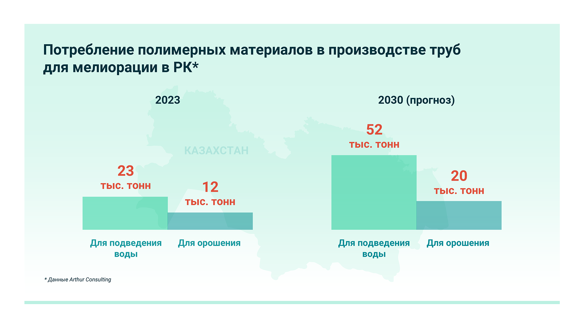 Дефицит водных ресурсов в Казахстане стимулирует реализацию госпрограмм по внедрению водосберегающих технологий, что поможет развитию спроса на полимерные трубопроводные системы для мелиорации.