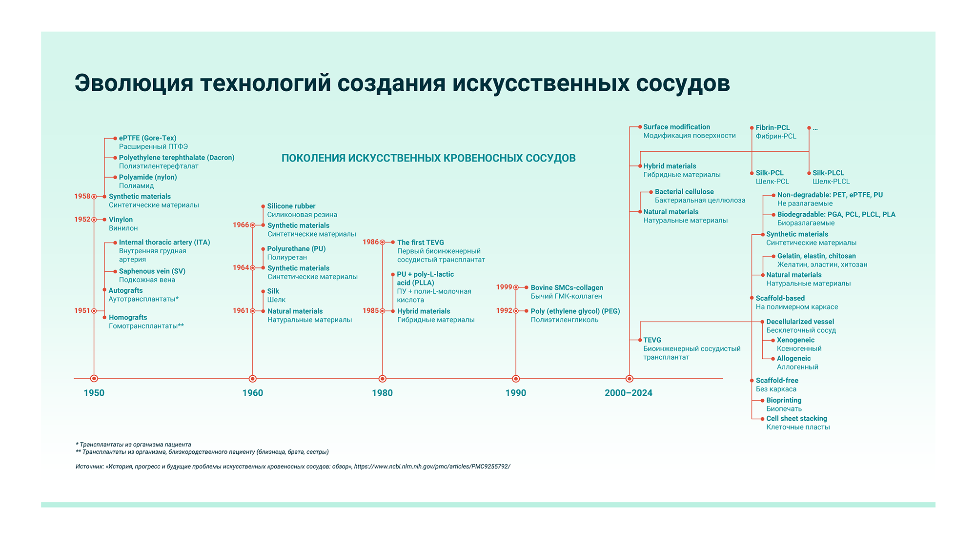 Источник: «История, прогресс и будущие проблемы искусственных кровеносных сосудов: обзор», https://www.ncbi.nlm.nih.gov/pmc/articles/PMC9255792/ |