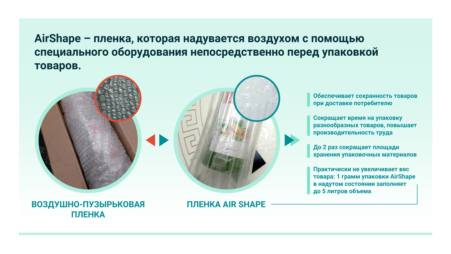 - Практически не увеличивает вес товара: 1 грамм упаковки AirShape в надутом состоянии заполняет до 5 литров объема.