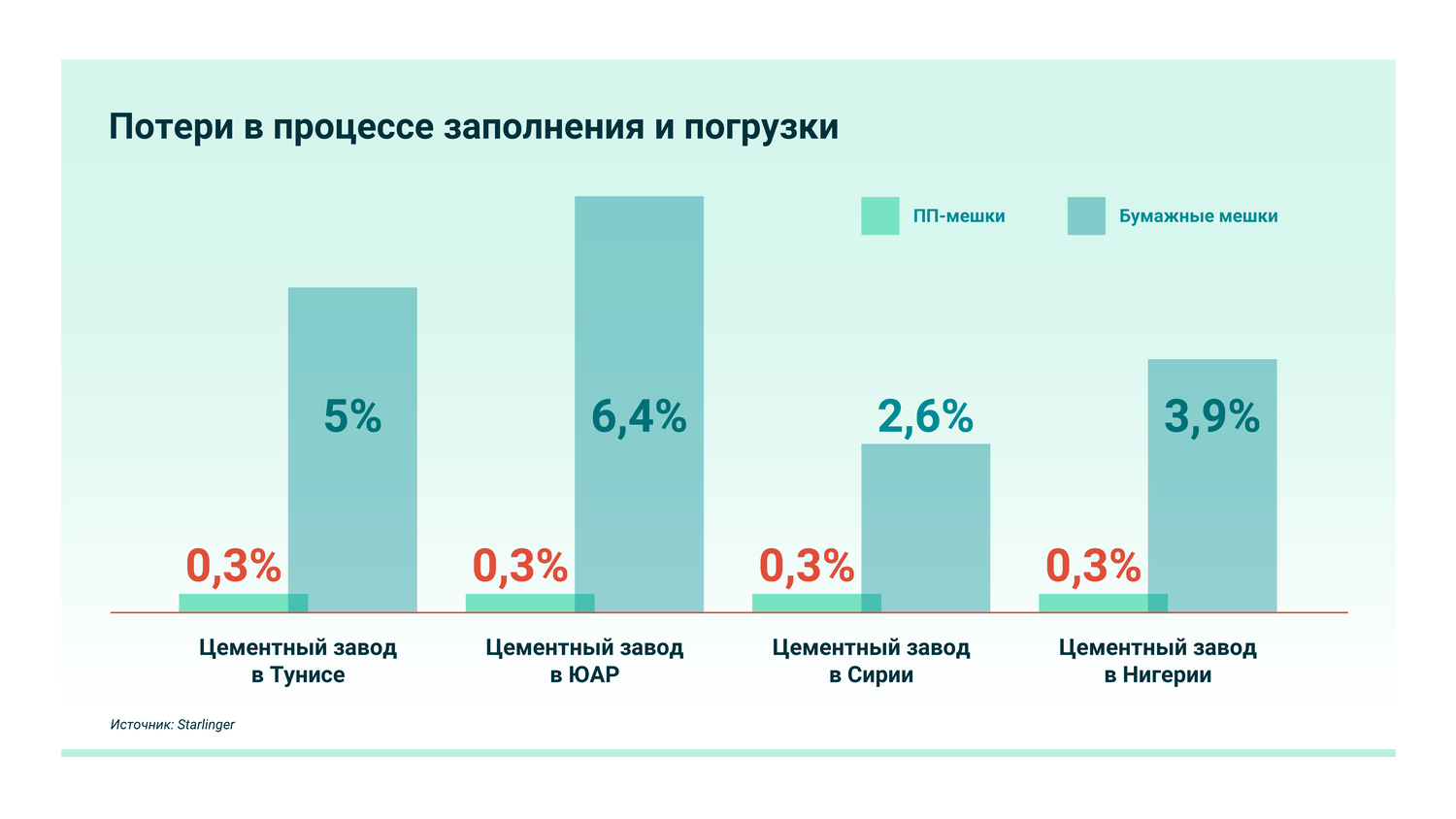 При фасовке в бумажные мешки российские производители цемента закладывают от 3% до 4,5% потерь «на разрыв» при транспортировке и хранении. Опыт использования полипропиленовых коробчатых мешков на четырех цементных заводах в разных странах показал снижение таких потерь до десятых долей процента.