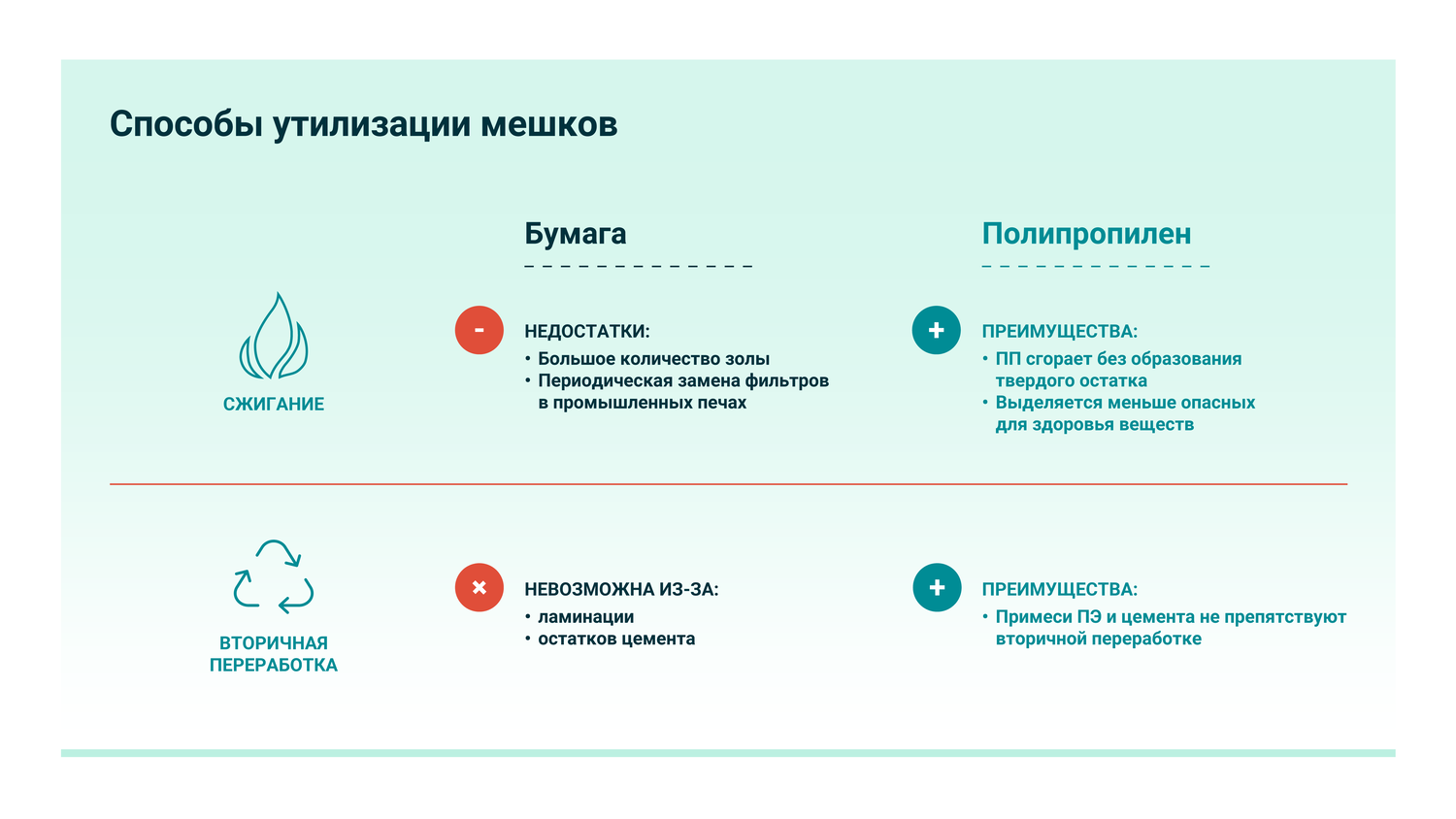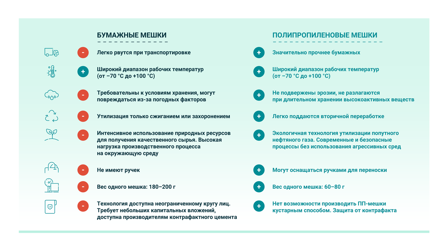Полипропиленовые мешки коробчатой формы экологичнее бумажных еще и потому, что снижают затраты топлива при транспортировке и уменьшают количество цемента, попадающего в окружающую среду при перевозке и хранении. В сравнении даже с самыми лучшими бумажными мешками ПП-мешки выигрывают почти по всем параметрам.