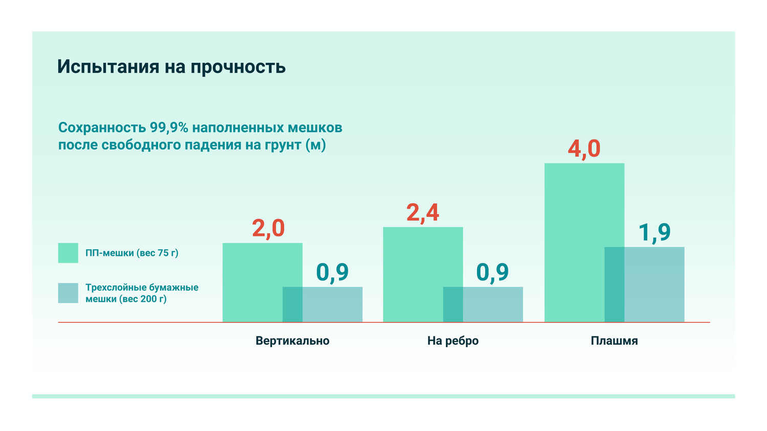 Прочность. Полипропиленовые мешки при меньшем весе обладают повышенной прочностью и выдерживают высокие механические и ударные нагрузки. Лабораторные испытания показали, что в 99,9% случаев упаковка остается целой даже при падении с высоты нескольких метров. В сравнении с 200-граммовым трехслойным бумажным мешком 75-граммовый коробчатый мешок из полипропилена в 2–4 раза прочнее, в зависимости от позиции падения.
