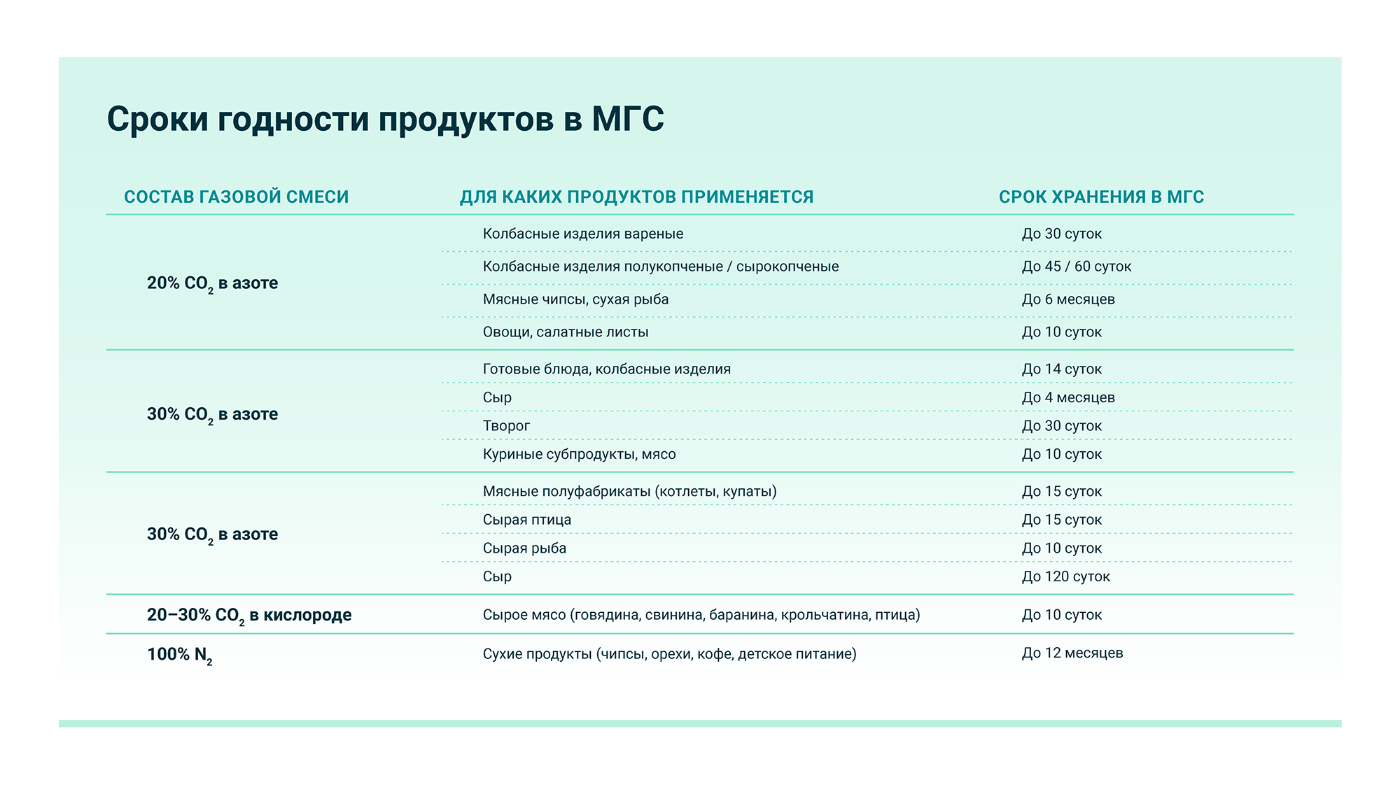 МГС-упаковка обладает явными преимуществами, она позволяет сохранить товар свежим, помогает продлить срок хранения без дополнительного воздействия непосредственно на сам продукт. Применение модифицированной газовой среды – самый современный, безопасный и универсальный метод упаковки любых скоропортящихся продуктов: фруктов, овощей, рыбы, мяса, полуфабрикатов, колбас и даже кондитерских изделий.