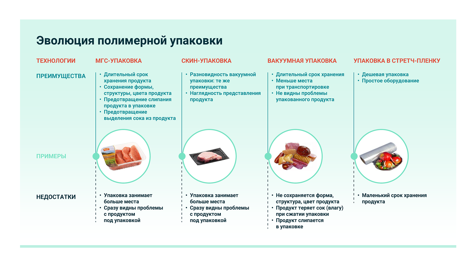 Так, например, для того, чтобы донести свежий продукт из ближайшего магазина до дома и тут же его приготовить, достаточно будет упаковать его в стретч-пленку. А если требуется доставить продукт с увеличенным сроком годности через весь город в общественном транспорте, чтобы приготовить обед на следующий день, понадобится как минимум герметичная вакуумная или скин-упаковка, занимающая немного места и предотвращающая подтекание. Но все большую популярность завоевывает у потребителя МГС-упаковка, обеспечивающая длительный срок хранения, сохранение структуры, формы и цвета продукта, предотвращающая слипание продукта в упаковке и выделение влаги. В таблице наглядно представлены преимущества и недостатки всех вышеназванных способов упаковки с использованием полимерных материалов.