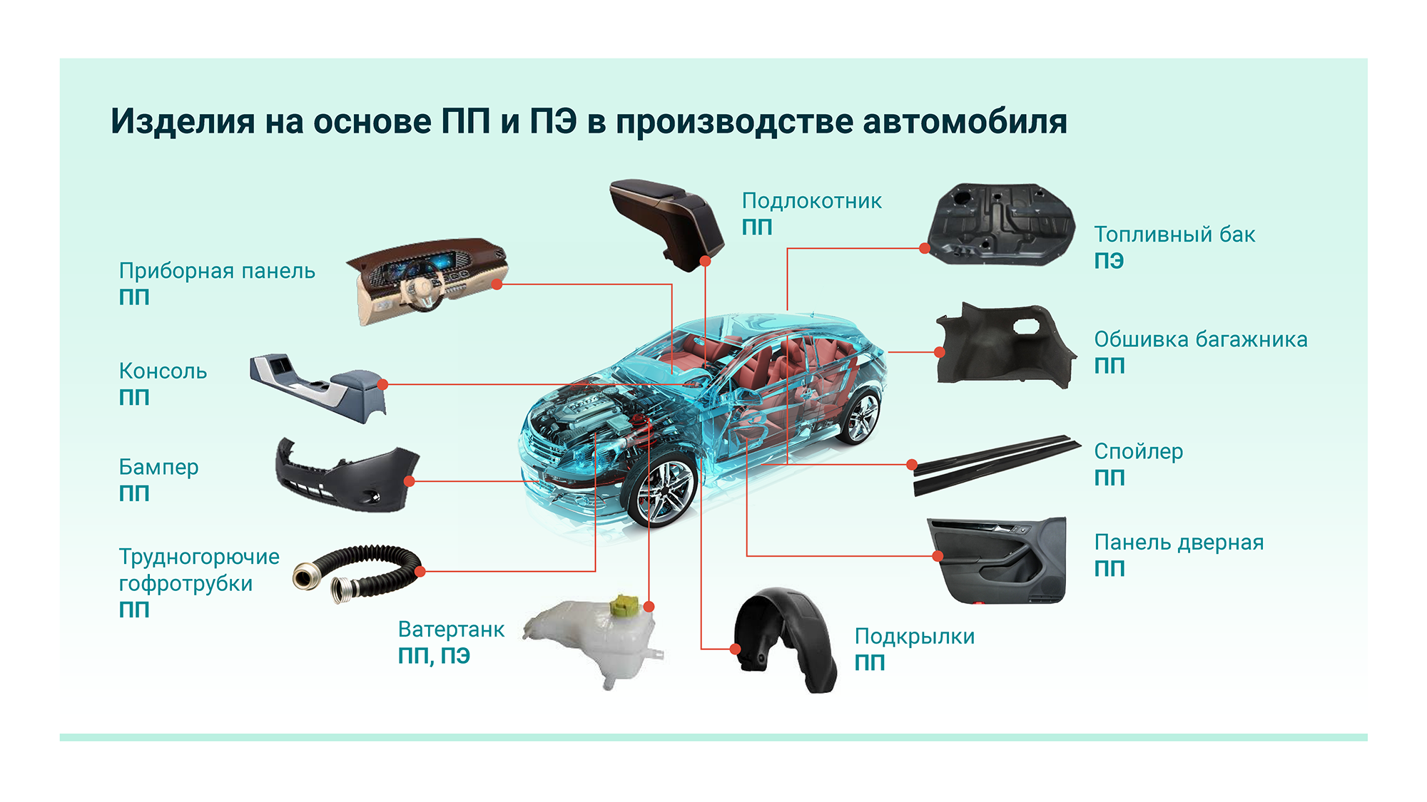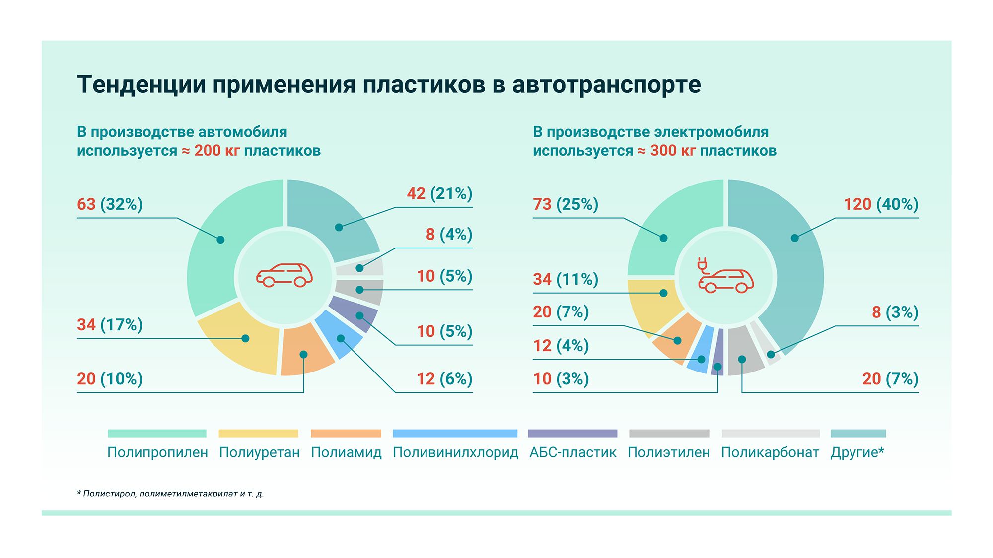 Чем современнее конструкция автомобиля, тем больше в нем полимеров. В легковом автомобиле с ДВС используется около 200 кг пластиков, а в электромобиле – 300 кг. На долю полиэтилена (ПЭ) в среднем приходится от 5% до 7% полимерных материалов, на долю полипропилена (ПП) – от 25% до 32%. Новейшие модификации ПП в электромобилях все чаще используются как инженерные (конструкционные) пластики.