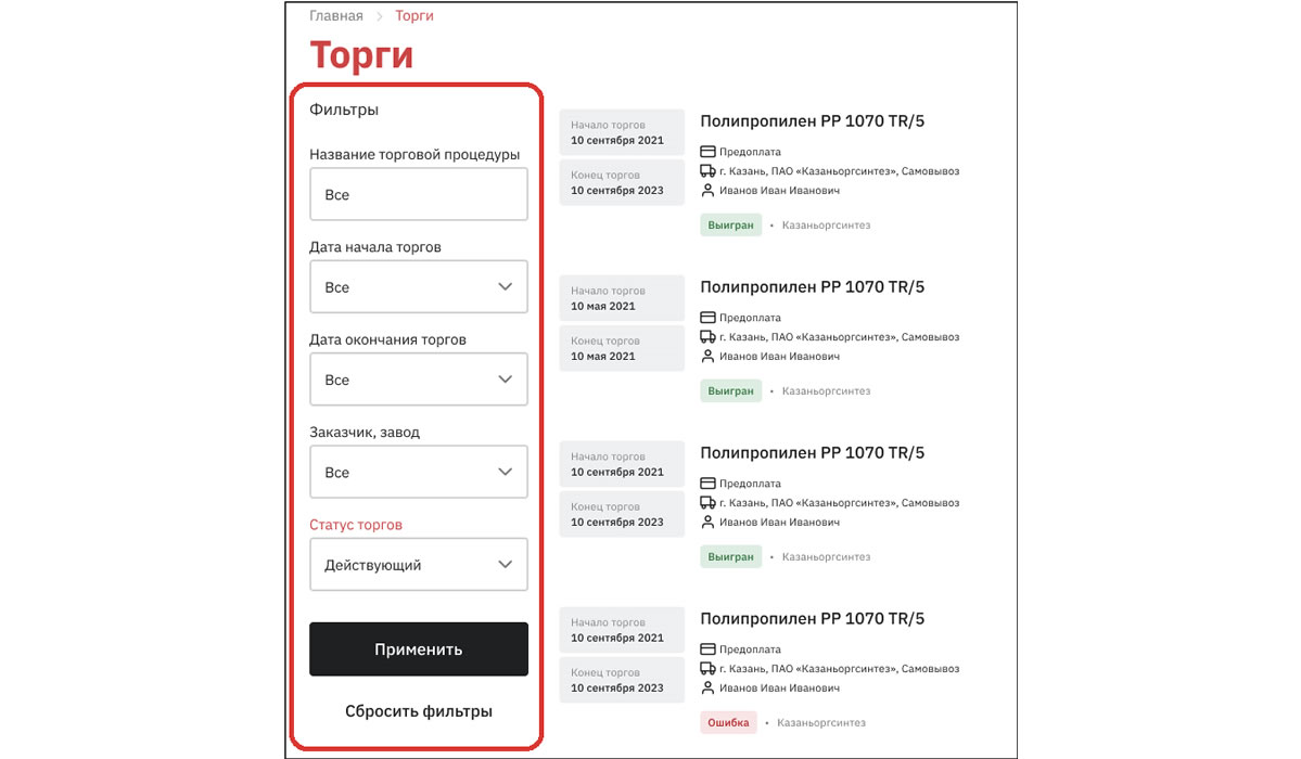 Воспользуйтесь фильтрами, чтобы определить подходящие торги. Вы можете использовать поиск по названию процедуры, дате начала или окончания торгов, наименованию поставщика и по статусу торгов.