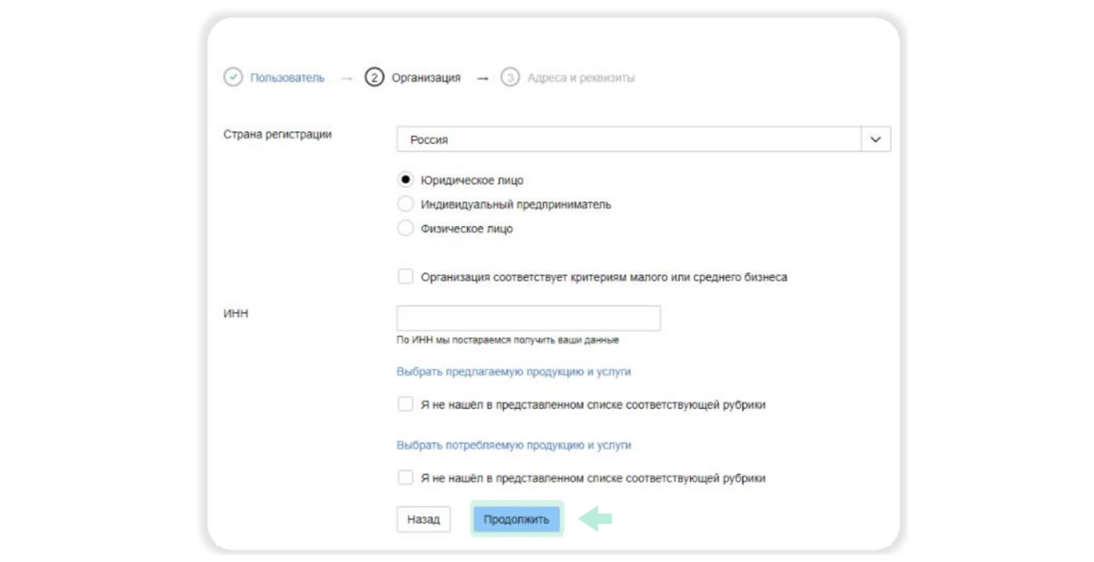 Шаг 1-й – укажите резидентство компании, ИНН и данные контактного лица, а также согласитесь с условиями пользовательского соглашения. Нажмите кнопку «Далее» для перехода на следующий шаг.