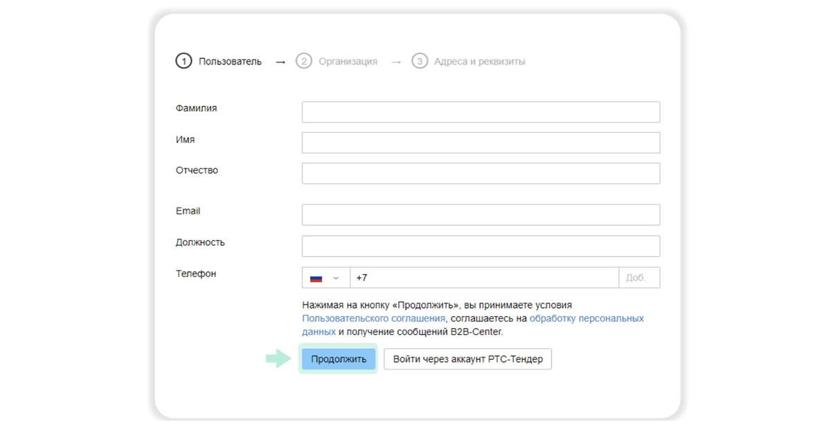 Зайдите на сайт B2B-Center. Нажмите кнопку «Зарегистрироваться за 5 минут». Вы попадете на форму регистрации.