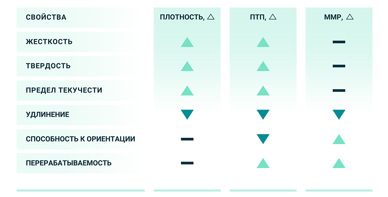 Плотность полимера связана со степенью кристалличности и определяет его способность к кристаллизации. Если полимер имеет линейное строение без разветвлений (например, HDPE), его плотность и степень кристалличности будут высокими. С повышением плотности полимера увеличиваются: