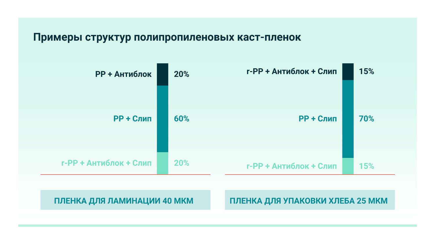 Важная сфера применения каст-пленок – упаковка продуктов питания. Например, пленки из полипропилена широко используются для упаковки хлебобулочных изделий и для ламинации других упаковочных материалов. Структура таких пленок довольно типична – средний слой состоит из гомо-полипропилена, который обеспечивает прочностные характеристики. Наружные слои обычно содержат сополимер пропилена с этиленом или бутеном, который придает пленке термосвариваемость, а также облегчает активацию поверхности коронным разрядом для последующей печати. В рецептурах большинства CPP-пленок используются антиблокирующие и скользящие добавки для облегчения дальнейших процессов переработки (печати, ламинации, упаковки).