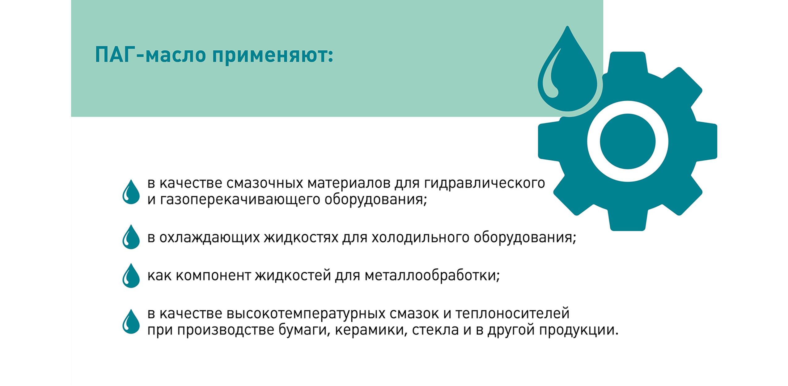 ПАГ-масло имеет широкую сферу применения: в качестве смазочных материалов его используют в гидравлике и газоперекачивающем оборудовании, в охлаждающих жидкостях, например в холодильной технике (компрессоры хладагента), как в бытовой, так и технике специального назначения (аналитические, медицинские приборы). Кроме того, в жидкостях для металлообработки, трансмиссионных маслах, цепных маслах, пищевых смазках и др. Также ПАГ-масла применяют в качестве высокотемпературных смазок и теплоносителей в бумажной, керамической, стекольной и других отраслях промышленности.