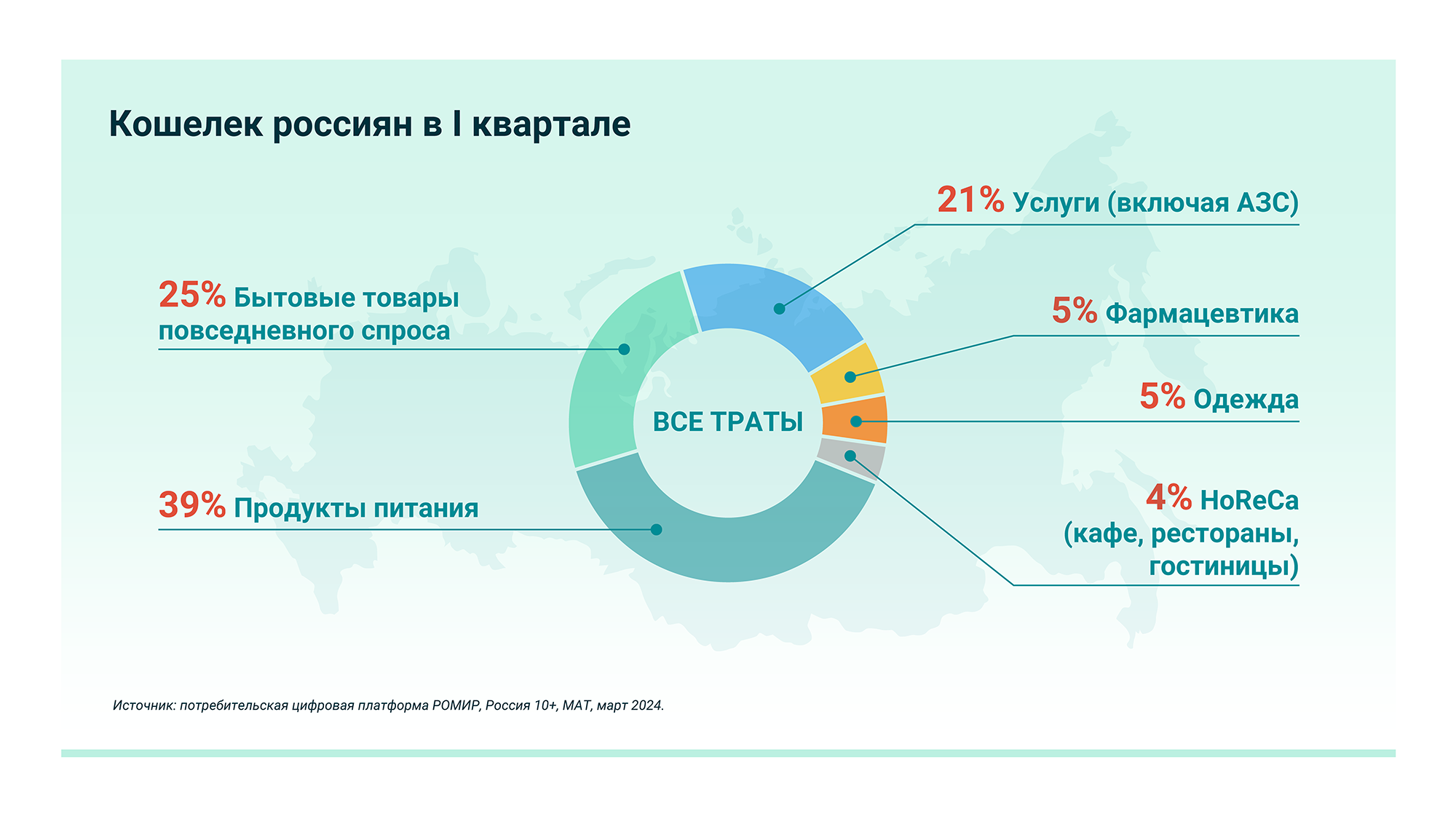 В 2024 году покупатели в меньшей степени, чем в 2023 году, определяли свое поведение как режим экономии, главными паттернами которого были отказ от дорогостоящих покупок, перераспределение бюджета в пользу самого необходимого (прежде всего, еды), сокращение расходов на отдых и развлечения. Исследователи выяснили, что россияне увеличили объем свободных денег. В структуре расходов доля затрат на продовольственные товары составила 39%, еще 25% потребители тратили на повседневные непродовольственные товары. Остальное – услуги, одежда, фармацевтика и HoReCа.