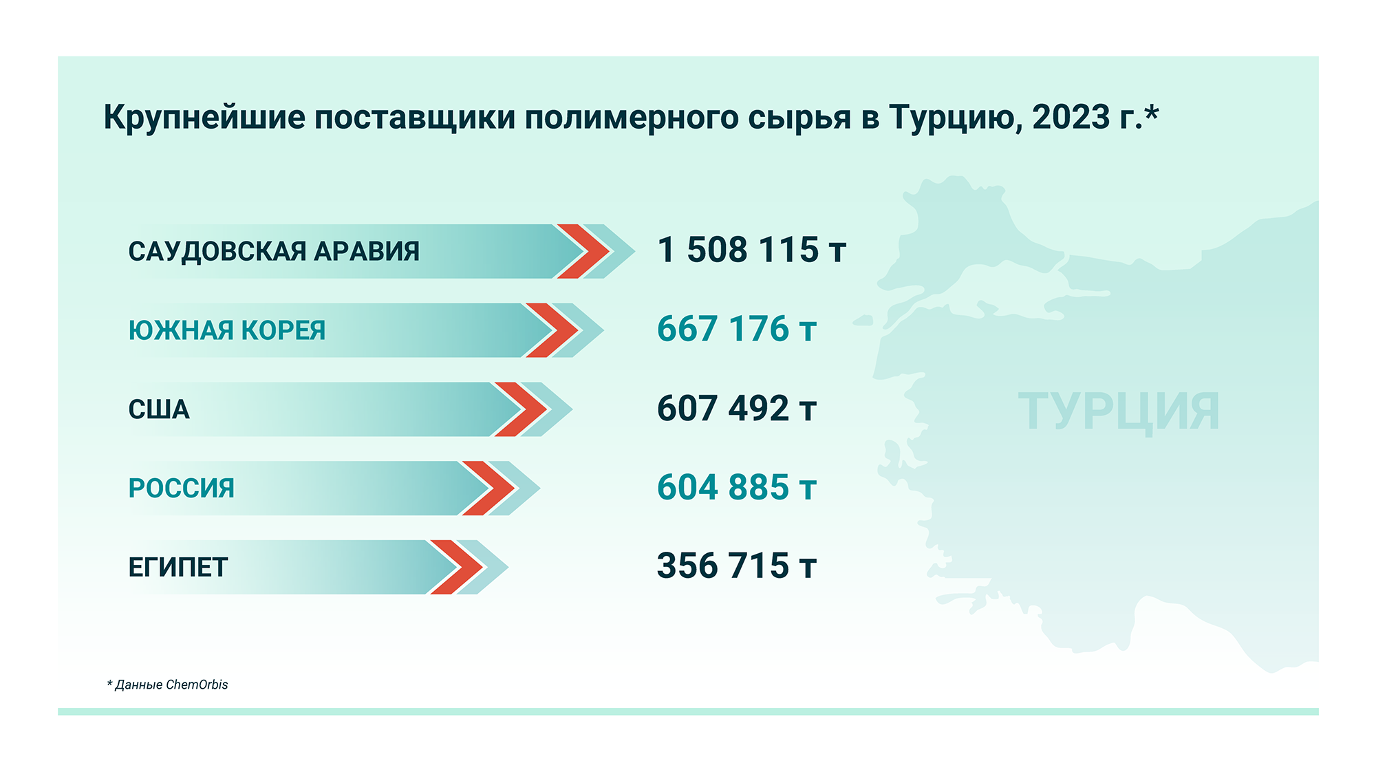 Согласно статистике ChemOrbis, импорт полимеров в Турцию в 2023 году достиг рекордного уровня, приблизившись к 6,3 млн т, что на 5% больше, чем в 2022-м. Импорт линейного полиэтилена низкой плотности, полиэтилена высокой плотности, поливинилхлорида (ПВХ) и АБС-пластика превзошел ожидания, установив новые вершины, в то время как рост поставок полипропилена и полиэтилена низкой плотности был более скромным. Крупнейшими полимерными экспортерами стали Саудовская Аравия, Южная Корея, США, Россия и Египет.