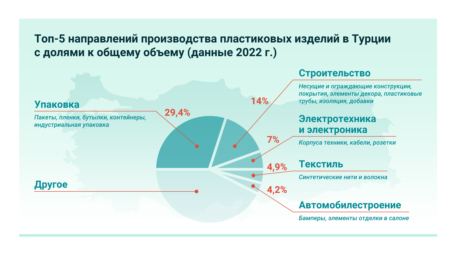 Турецкая промышленность сильно зависит от зарубежных поставок нефтехимической продукции для дальнейшей переработки. По данным Турецкой ассоциации переработчиков пластмасс (PAGEV), в сфере производства товаров из пластика импорт обеспечивал до 85% всего сырья по состоянию на конец 2022 года.