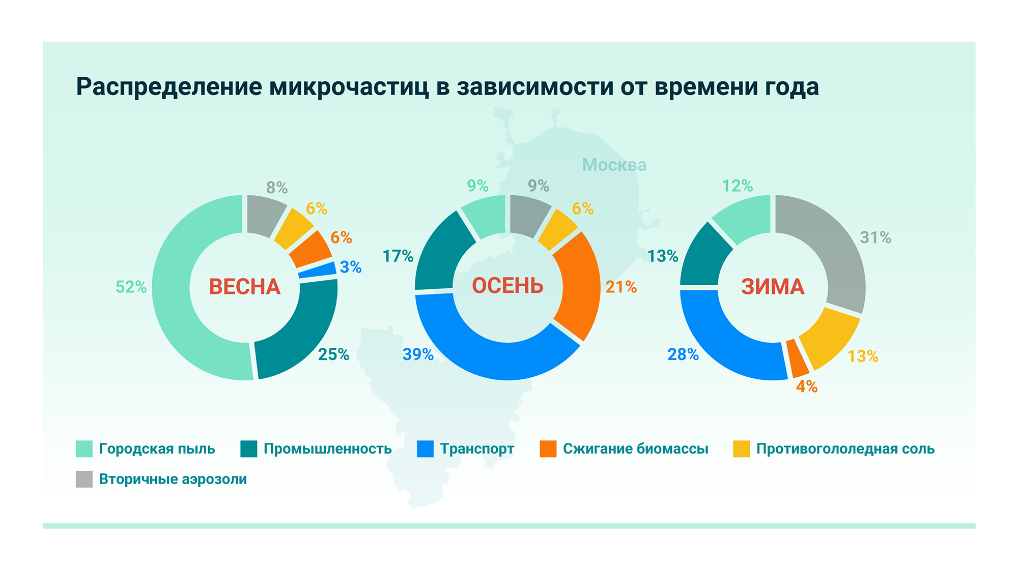 Недавнее исследование, проведенное в Москве, показало, как распределяются доли микрочастиц из разных источников в зависимости от времени года: