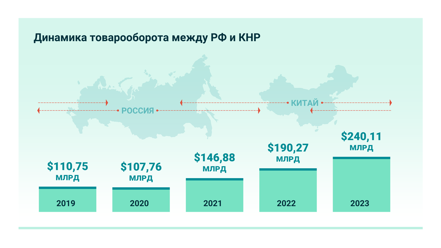 Показатели товарооборота ежегодно бьют предыдущие достижения. По данным Главного таможенного управления КНР, в 2023 году торговый оборот между РФ и КНР увеличился на 26,3% до 240,11 млрд долларов.