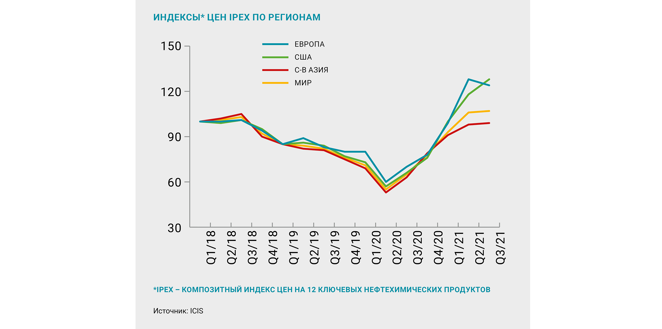 РЕГИОНАЛЬНЫЕ ОСОБЕННОСТИ СПРОСА И ПРЕДЛОЖЕНИЯ НА НЕФТЕХИМИЧЕСКИЕ ПРОДУКТЫ ПРИВЕЛИ К РАЗНОНАПРАВЛЕННОЙ ДИНАМИКЕ ИНДЕКСА ЦЕН IPEX. В США КОТИРОВКИ ПРОДОЛЖИЛИ РОСТ, В АЗИИ ОСТАВАЛИСЬ СТАБИЛЬНЫМИ, В ЕВРОПЕ ПАДАЛИ