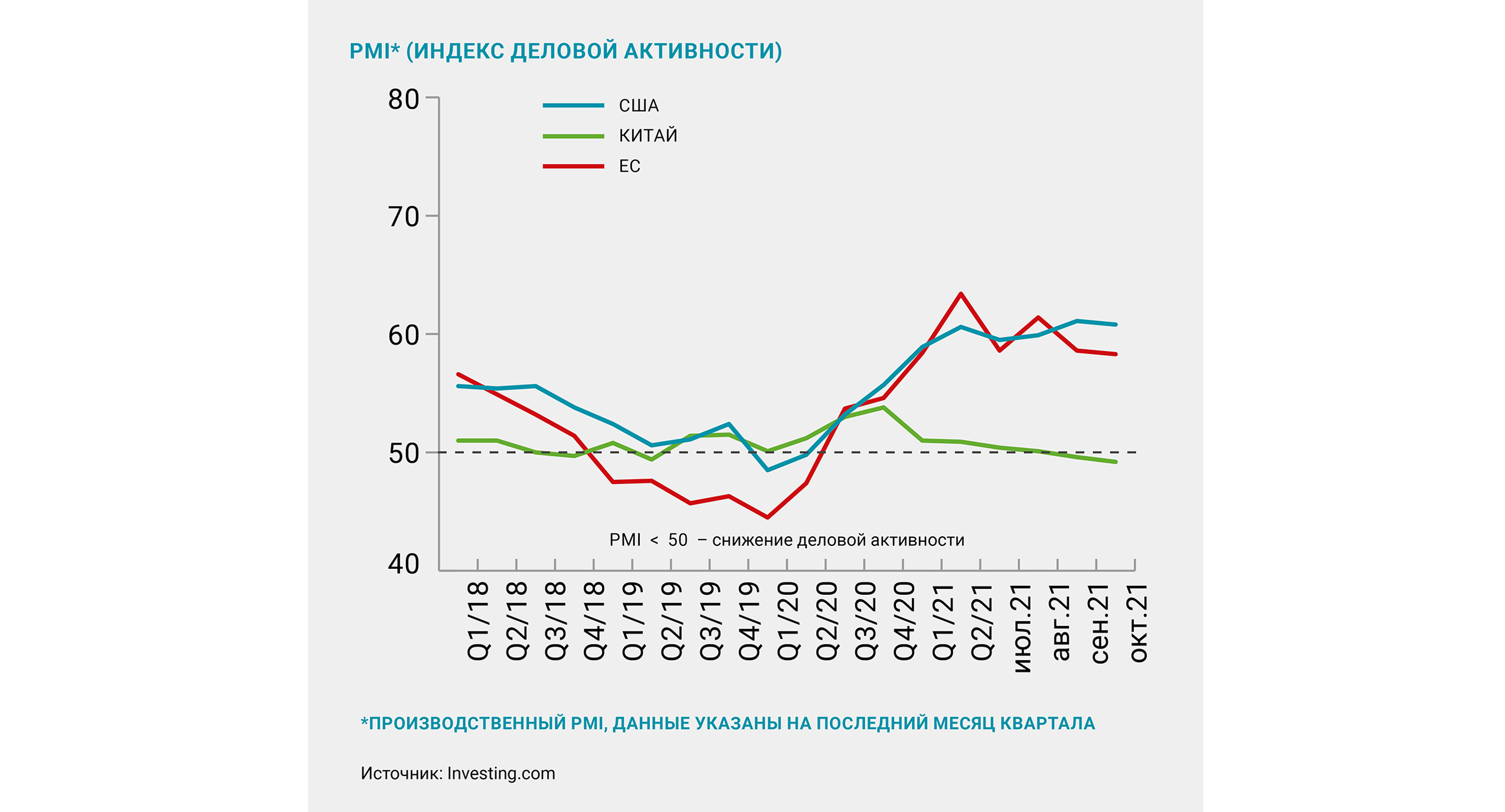 В Китае противоположные тенденции: индекс PMI и инфляция снижаются. Это привело к росту ВВП по итогам III квартала на 4,9% против ожидаемых 5,2%. При этом в октябре потребительская инфляция резко выросла до 1,5%, а инфляция цен производителей составила 13,5% – рекордное значение за последние 26 лет.