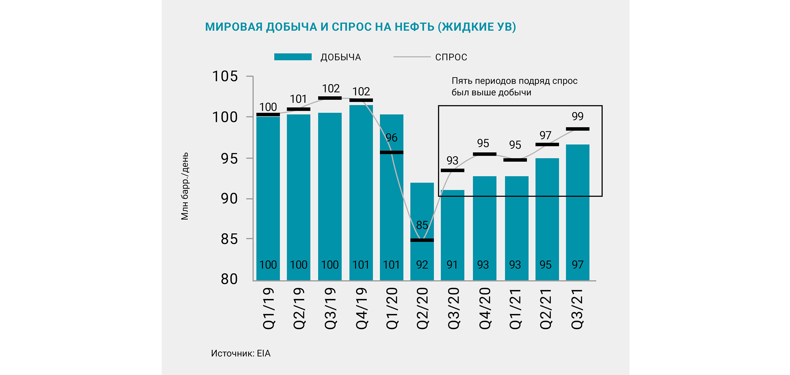 Средняя цена нефти Brent в III квартале выросла на 7% (кв/кв), составив 73,5 долл. за баррель. Рост обусловлен превышением спроса над предложением на 2 млн баррелей в день (средний показатель за III квартал, оценка EIA) из-за политики ОПЕК+, в рамках которой квоты не были дополнительно увеличены в сентябре и августе, несмотря на активный рост потребления. Таким образом, дефицит на рынке нефти сохраняется пять кварталов подряд. Кроме того, значимого роста добычи не было и в странах, не входящих в ОПЕК+, в том числе у сланцевых производителей нефти в США.