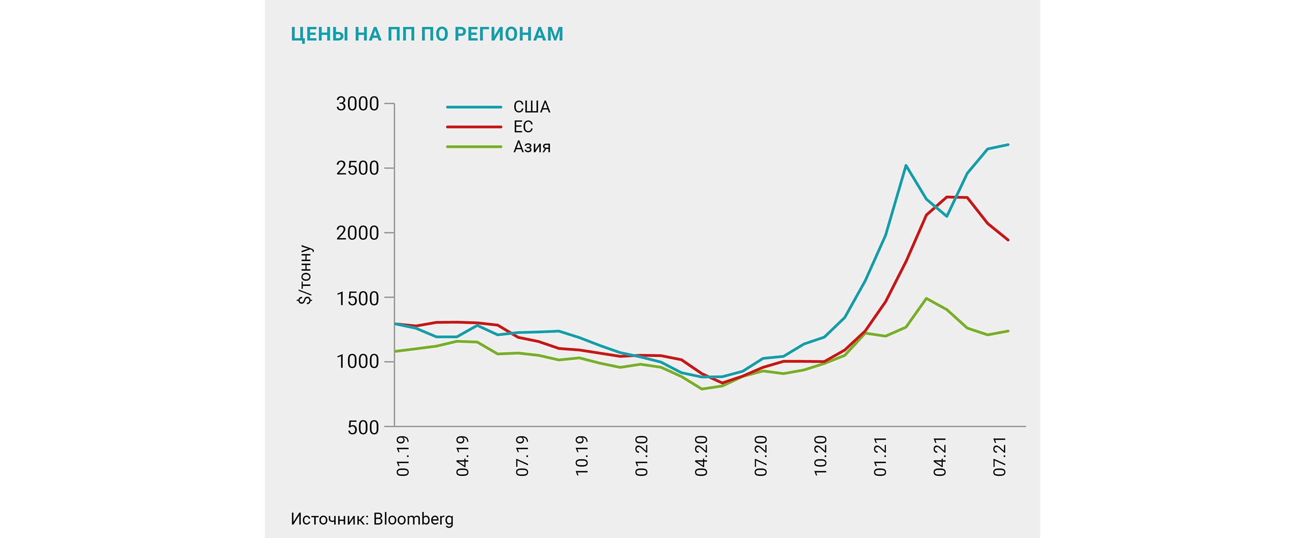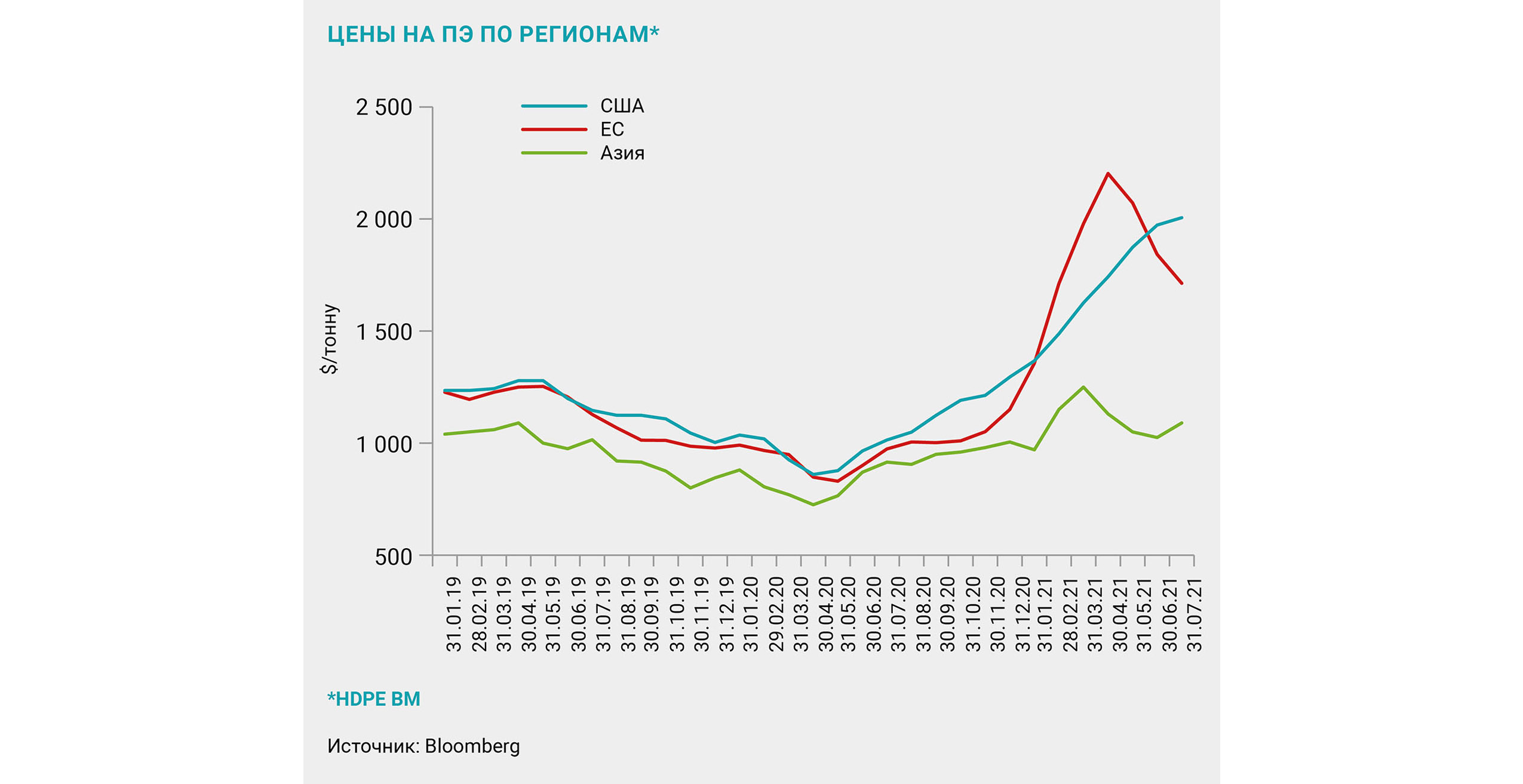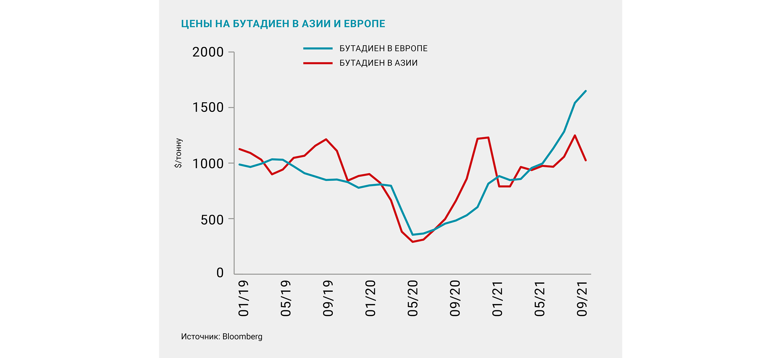 Основное изменение в европейском регионе – снижение цен после всплеска в II квартале 2021-го. Возвращение цен в привычный диапазон вызвано запуском мощностей после плановых и внеплановых остановов. В сентябре цена опустилась до 1885 долл. за тонну после пика этого года на уровне 2265 долл. за тонну, достигнутого в апреле.