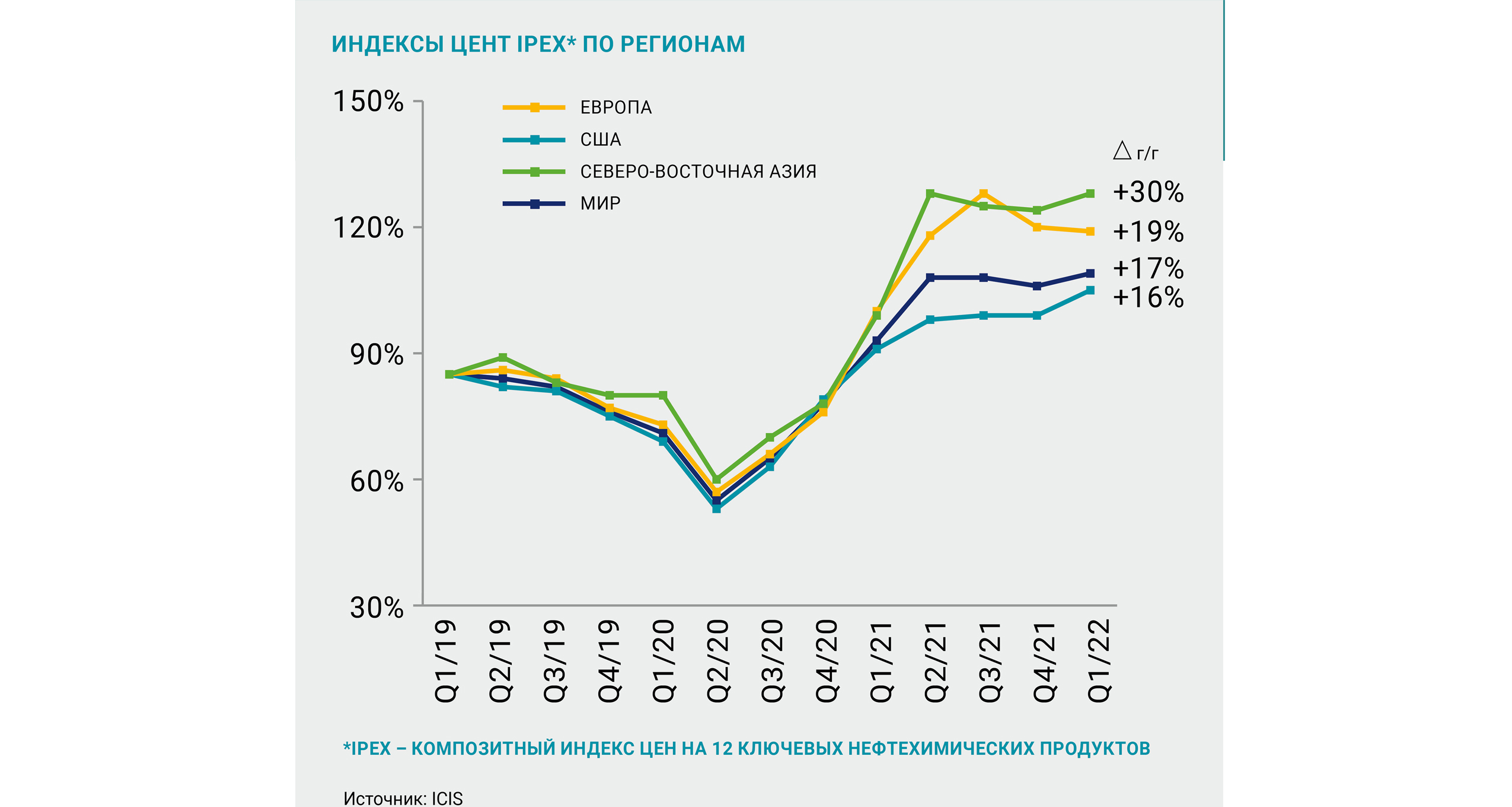 Глобальный индекс цен IPEX (ICIS) в I квартале 2022 года вырос на 3% кв/кв, наилучшая динамика наблюдалась в Азии (+6% кв/кв). Значительное влияние на цены нефтехимической продукции оказали рост стоимости сырья, а также сохраняющиеся логистические ограничения. Однако не все производители смогли переложить рост котировок сырья в цены конечных продуктов. В большинстве нефтехимических цепочек в I квартале 2022 года происходило снижение маржинальности, вызванное ростом стоимости сырья и нисходящей динамикой цен на продукцию.