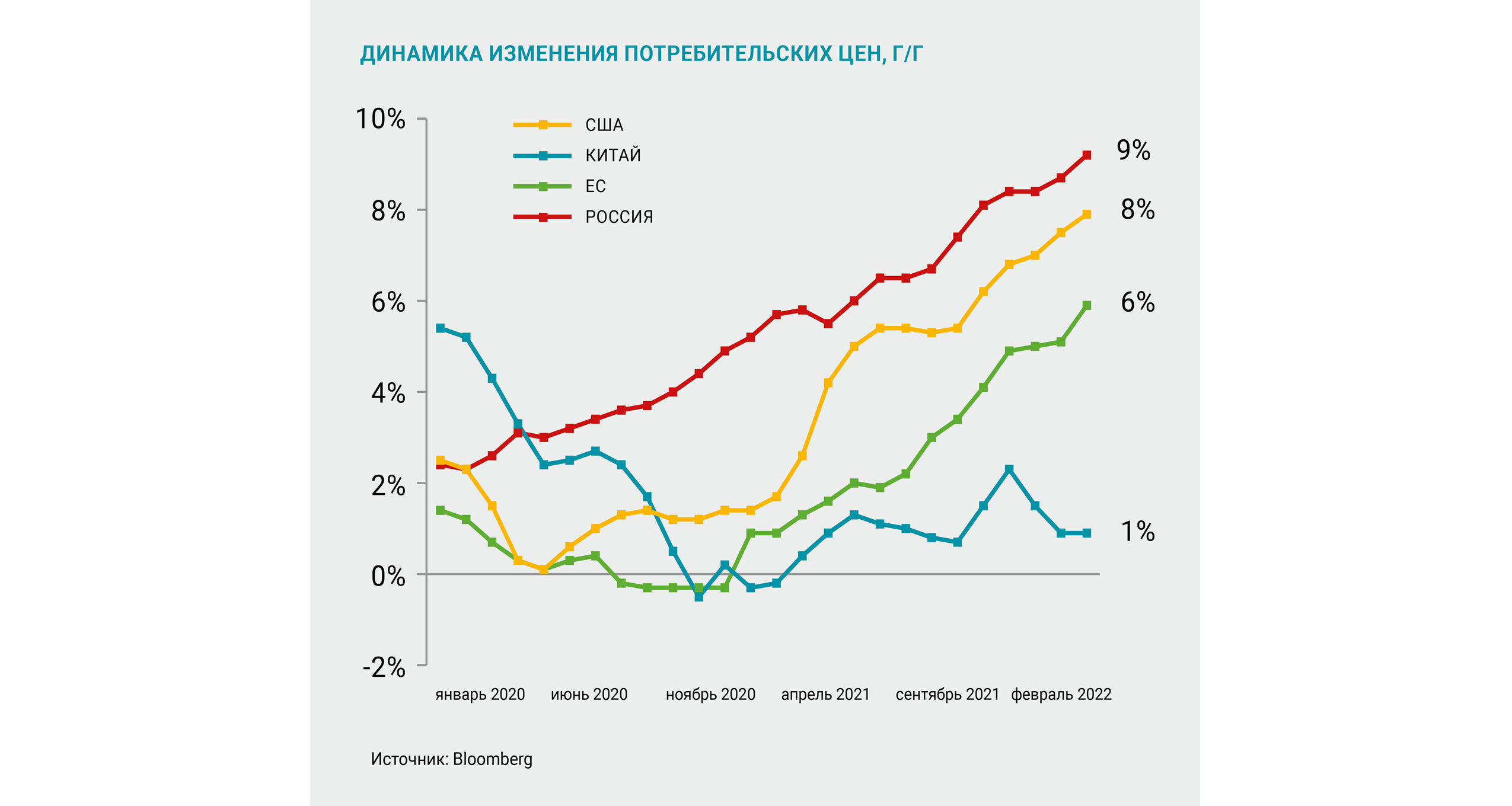 Для сдерживания инфляции ФРС и ЕЦБ намерены перейти к более жесткой монетарной политике и регулированию ключевой ставки. Согласно прогнозам, ключевая ставка в США на конец 2022 года будет находиться в диапазоне 2,25–2,5% при текущем уровне 0,25–0,5%.