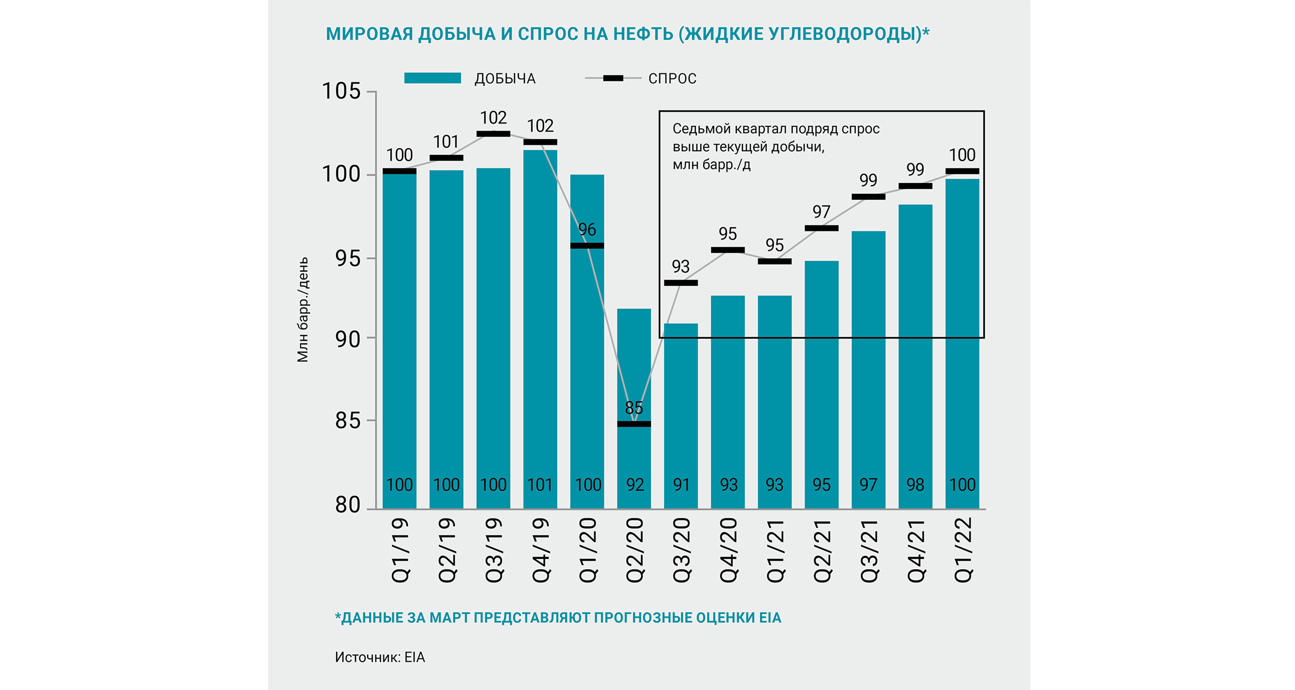 Глобальный рынок нефти седьмой квартал подряд находится в состоянии дефицита предложения, который, однако, снижался в I квартале 2022 года. Страны ОПЕК+ по-прежнему не достигают совокупной квоты на добычу, по последним оценкам, на 1,1 млн барр./д.