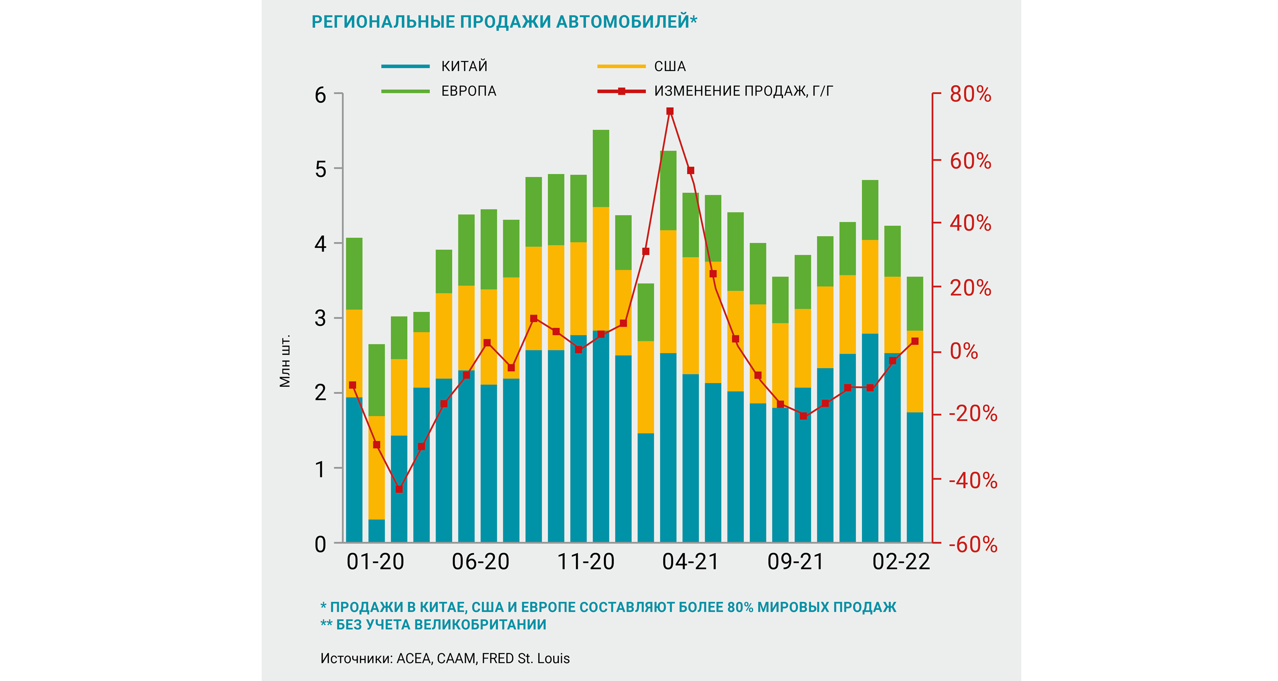 Дополнительное давление на рынок оказывали опасения падения темпов продаж автомобилей из-за нехватки комплектующих. IHS ожидает, что мировое производство автомобилей в 2022 году составит 81,6 млн единиц, что соответствует показателям 2021 года. Для сравнения: в спокойные 2018–2019 годы производилось 90–94 млн автомобилей в год.
