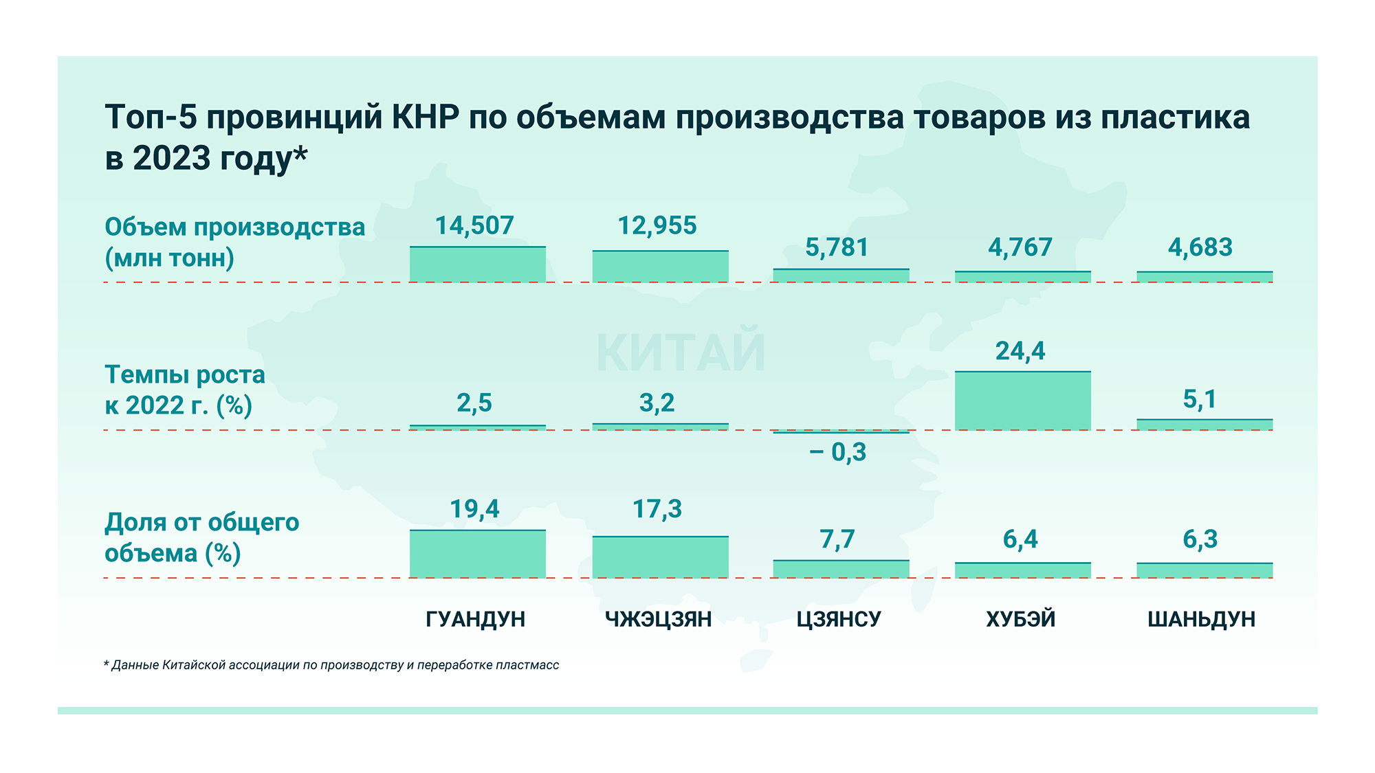 География производства в целом соответствует распределению промышленных мощностей КНР с акцентом на высокоразвитый и густонаселенный восток страны, где в 2023-м выпустили 2/3 всех товаров из пластмасс. На долю пяти провинций (всего их в КНР 34) приходится 57% выпуска пластмассовых изделий. Наибольший вклад обеспечивает провинция Гуандун: 19,4% от всего объема. Провинция Хэнань стала лидером по приросту производства (+ 85% к 2022 г.), тогда как в Сычуани выпуск продукции «просел» больше всего (– 9%).