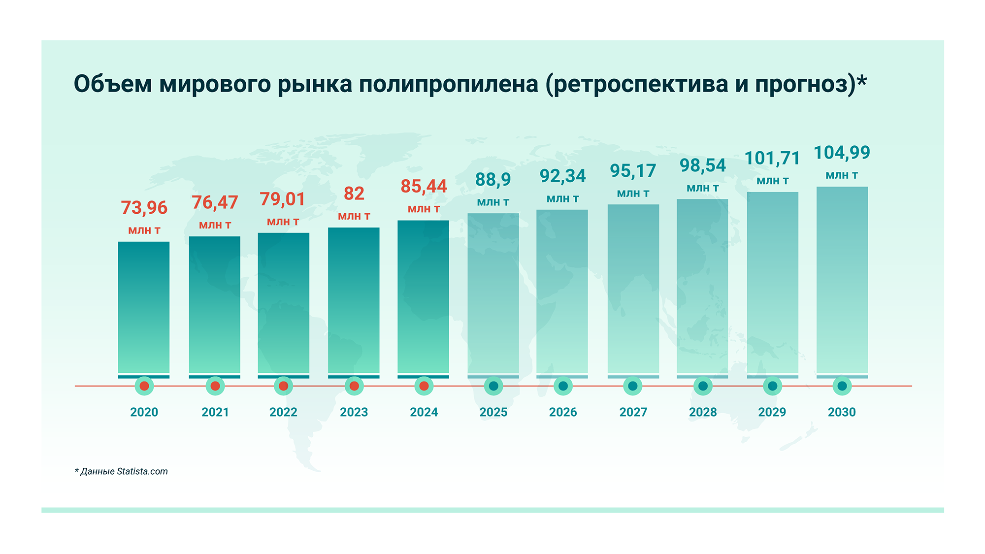 В агентстве Argus прогнозируют, что средний прирост производства ПП в мире в ближайшие 8 лет составит 4,3%, а объем мирового рынка к 2032 году достигнет 124 млн тонн. Эксперты Argus полагают, что средняя загрузка предприятий сначала снизится, но потом достигнет 84%, а некоторые производители потеряют клиентов из-за технологического отставания. При таком сценарии новейшие китайские заводы, выпускающие ПП, объективно найдут возможности сбыта внутри страны и за границей. Однако есть и более умеренные прогнозы по росту рынка ПП.