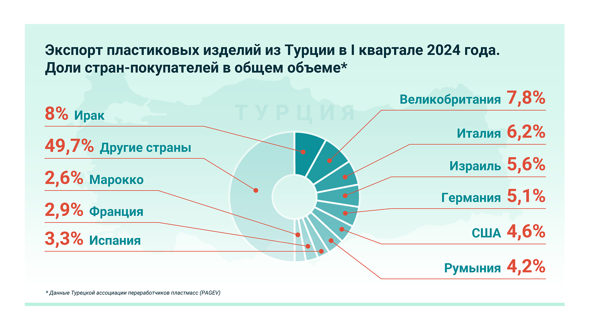 Отгрузки в 10 стран за рассматриваемый период дали 50,3% всего объема экспорта. Ирак, Великобритания, Италия и Германия стали главными покупателями товаров из турецкого пластика.