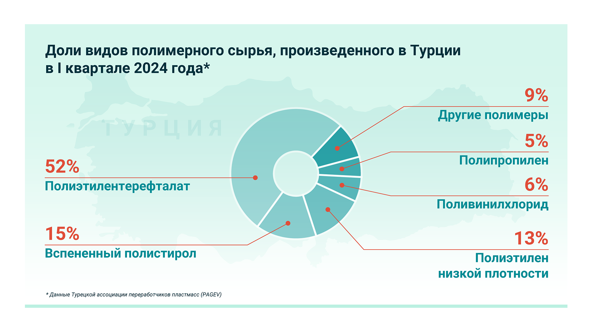 В отчетный период турецкие компании произвели 651 тыс. тонн полимерного сырья. Основной местный производитель – единственная в стране вертикально интегрированная нефтехимическая компания Petkim. Наибольшая доля среди всех видов полимеров – у ПЭТ: 52%.