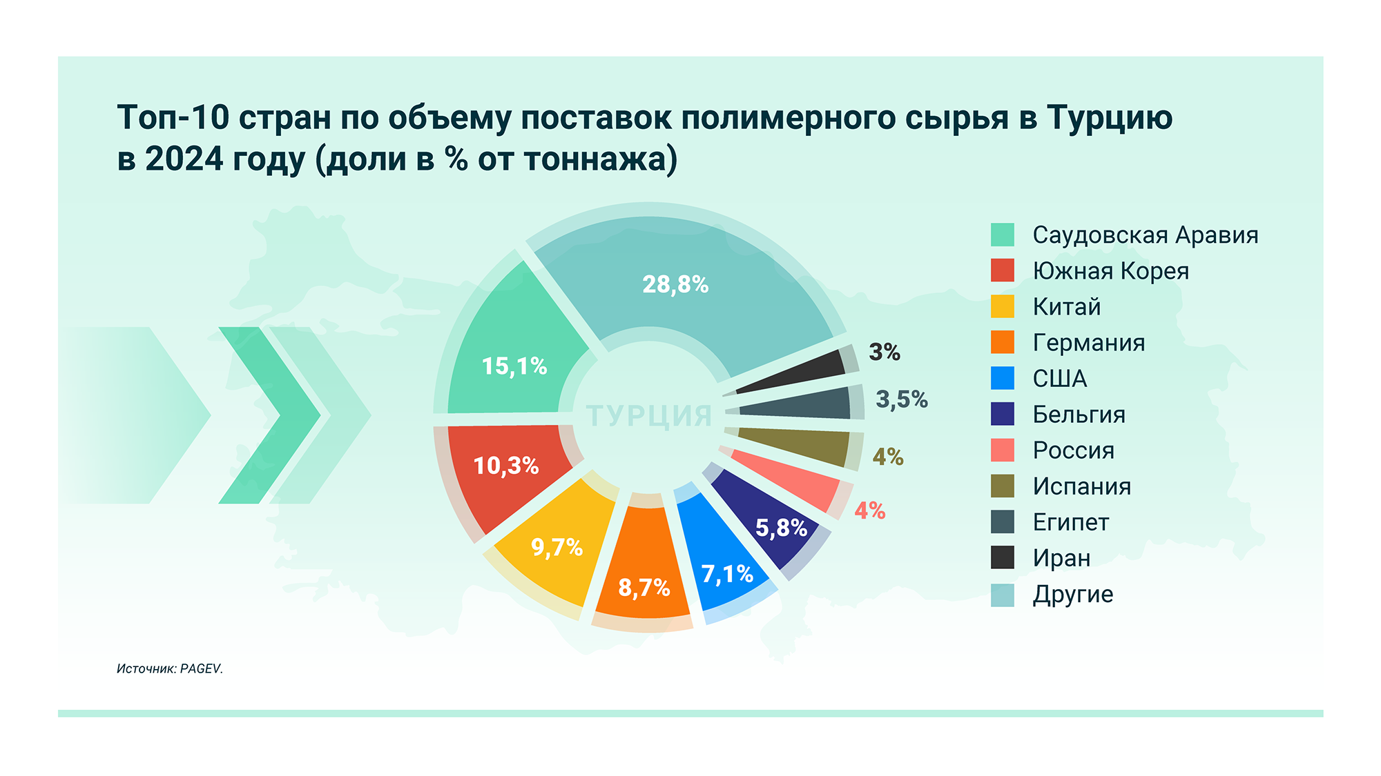Отрасль переработки полимеров в Турции зависит от импорта сырья. По данным PAGEV, импорт пластикового сырья в 2024 году снизился на 2,8% в натуральном выражении и на 4% в стоимостном выражении по сравнению с 2023 годом и составил 8,6 млн тонн и 11,6 млрд долларов. В агентстве Chemorbis отмечают, что снижение импорта ознаменовало конец длительного восходящего тренда, который продолжался с 2019 года.