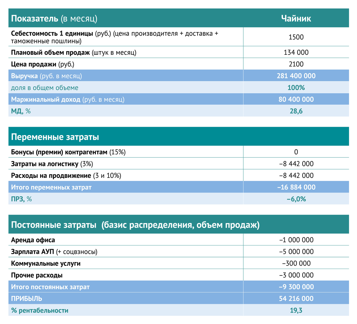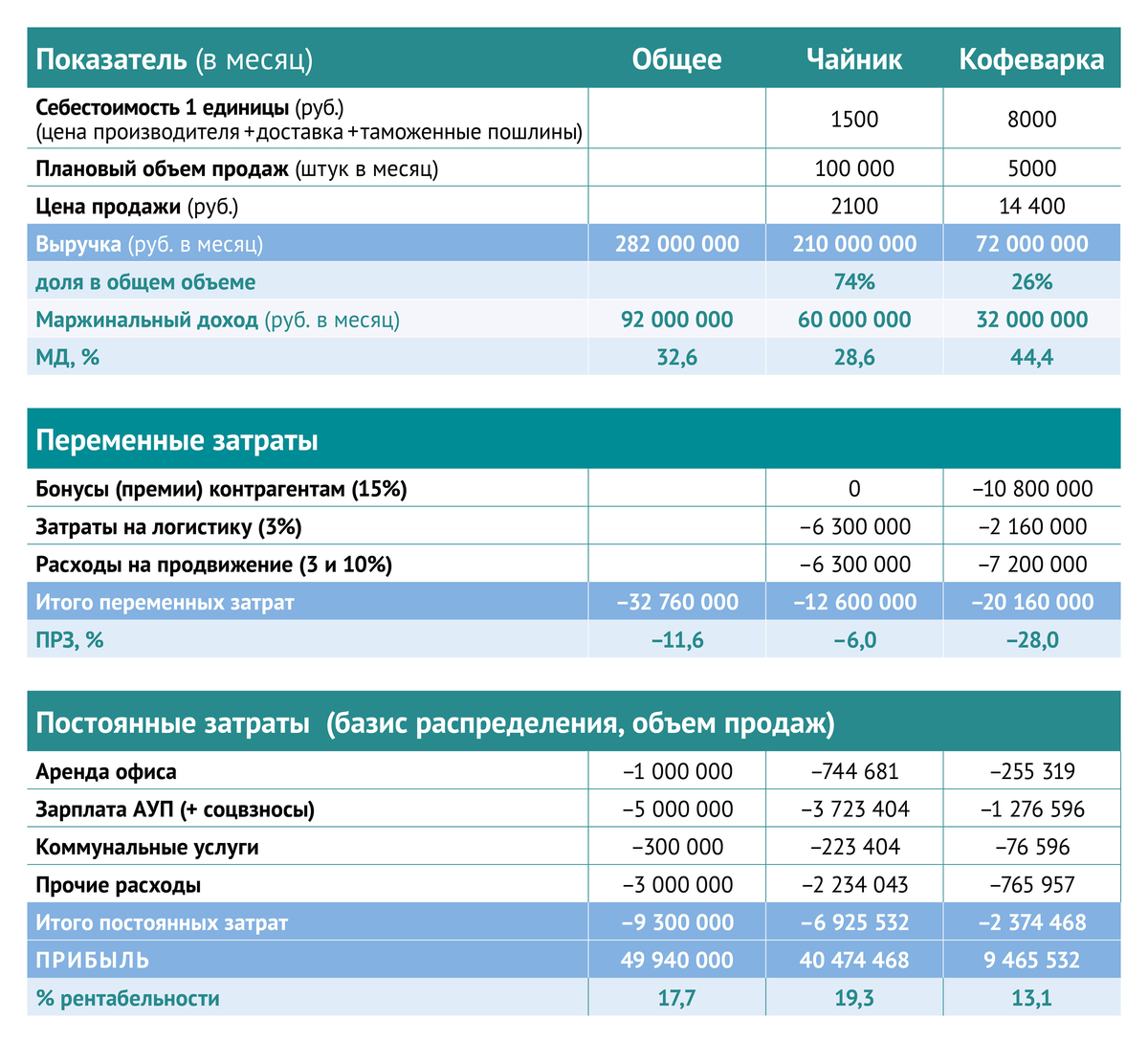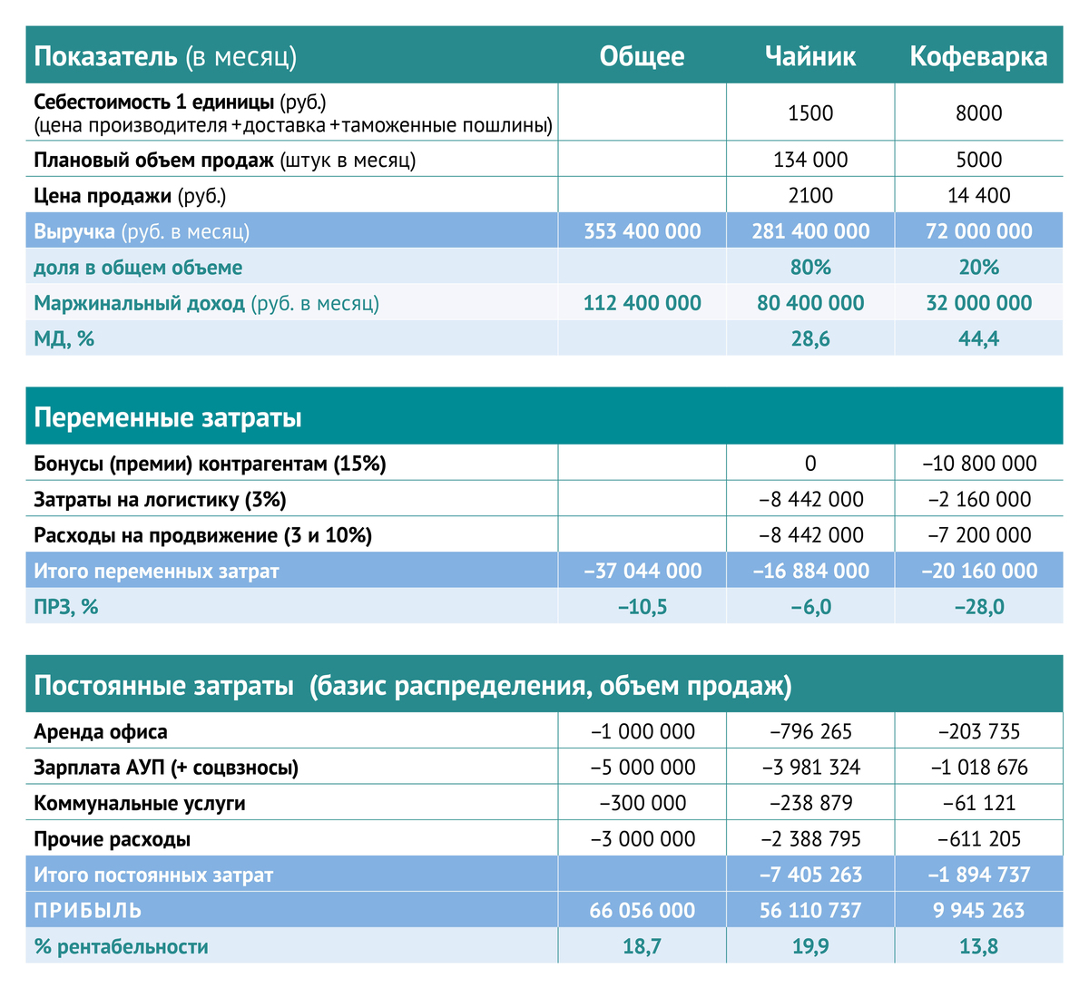 Оборот компании состоит из одного продукта – чайник. Он дешевый и простой с точки зрения технологичности, продается во всех каналах продаж, не требует каких-то дополнительных расходов на продвижение. Но маржинальный доход (разница между ценой продажи и себестоимостью товара) по этому продукту невысок – 28,6%. Поэтому менеджеры приняли решение добавить в линейку технически более сложный продукт – кофеварку. Маржинальный доход у нее значительно выше (44,4%). Вопрос: нужно ли компании переключаться на этот продукт? Чтобы ответить на него, важно правильно учесть и распределить все расходы.