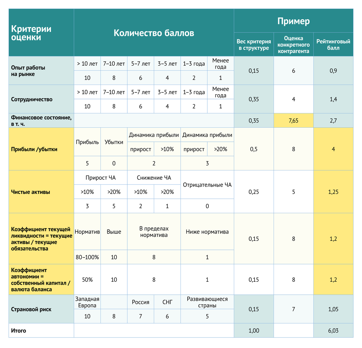 Для результатов оценки можно разработать балльную систему и рейтинг в зависимости от суммы баллов. Приведем пример.