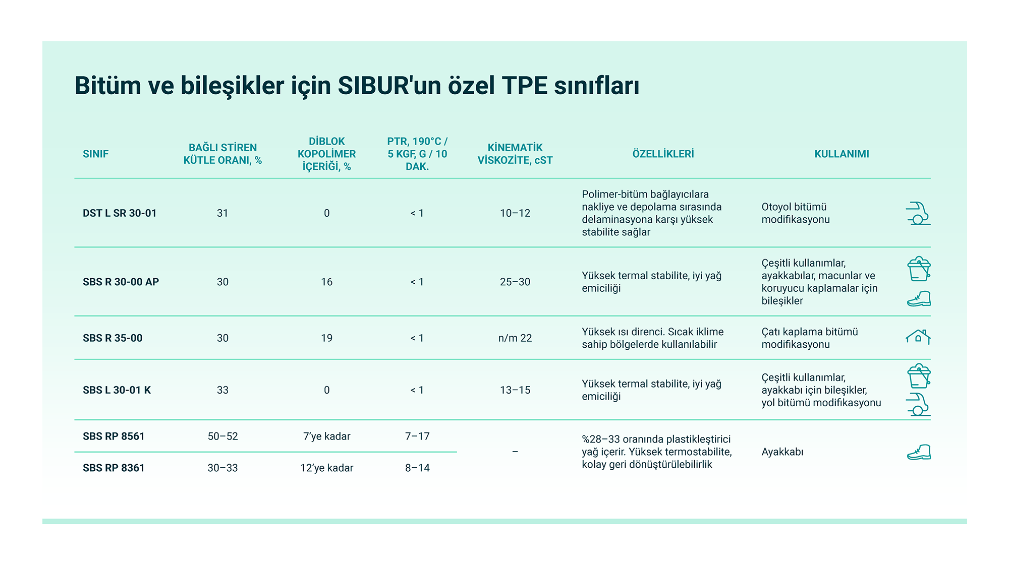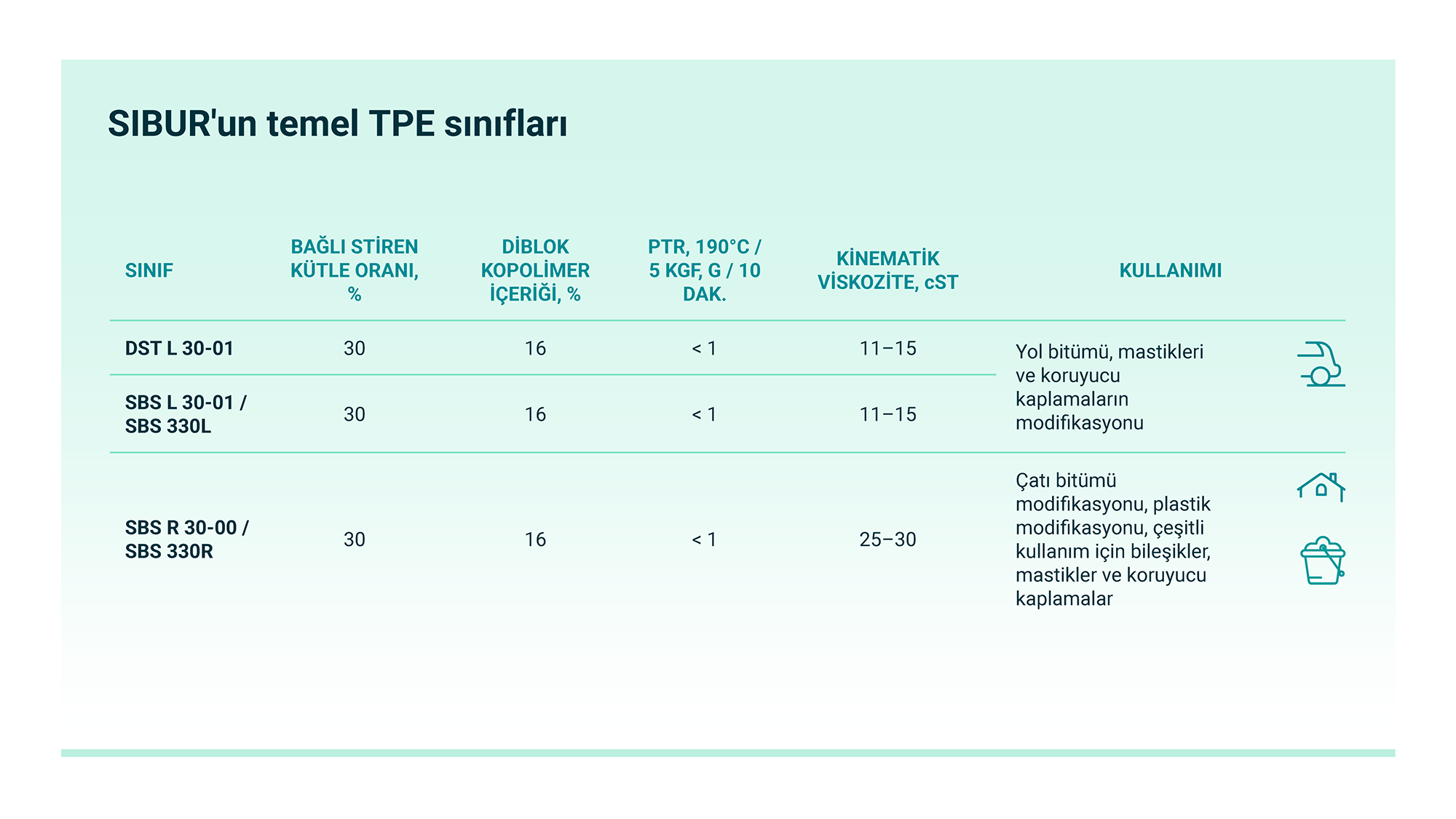 SIBUR'un TPE'lerinden SBS R 35-00, Türkiye gibi sıcak iklime sahip ülkelerde yaygın olarak kullanılmaktadır. Bu sınıf, esnek kiremit ve rulo yumuşak çatı kaplaması üretiminde bitümün modifiye edilmesinde kullanılır. Bu markanın artan stiren bileşeni içeriği nedeniyle de nihai malzemeye ısı direnci kazandırır. Otoyol bitümü modifikasyonu için özel bir sınıf olan DST L 30-01 SR sunulmaktadır. Onun en büyük avantajı, nakliye sırasında polimer-bitüm bağlayıcı karışımın delaminasyonunu (tabakaların ayrılmasını) önlemesidir.