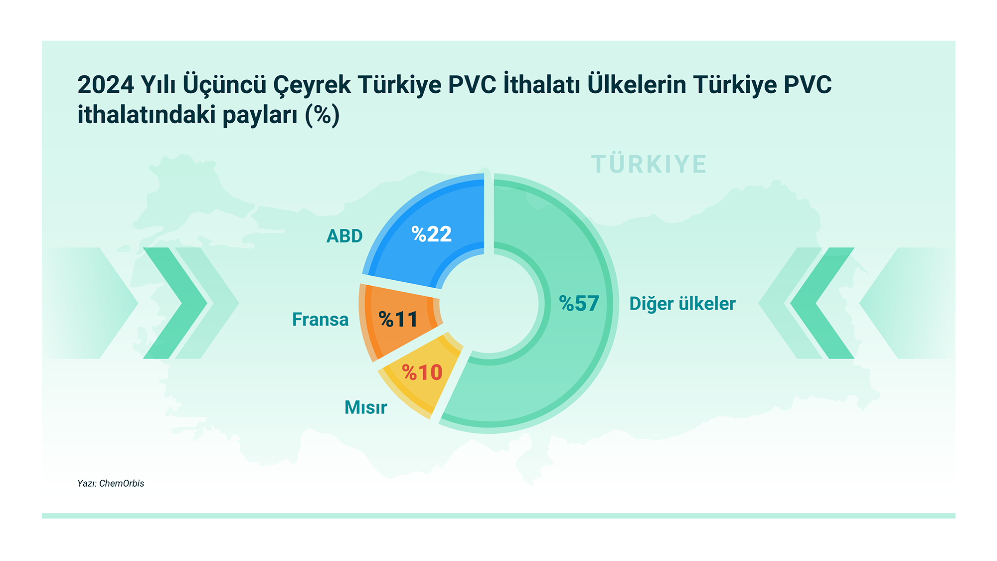 2024 yılının üçüncü çeyreğinde ABD, Türkiye’nin en büyük PVC tedarikçisi olmuştur.ABD, 33 bin ton PVC ihraç ederek Türkiye’ye yaptığı satışlardaki payını %14’ten %22’ye çıkarmıştır. Buna karşılık, 2023’ün üçüncü çeyreğinde en büyük tedarikçi konumunda olan Fransa’nın PVC ihracatı 10 bin tona düşmüş ve pazar payı gerilemiştir. Benzer şekilde, Mısır’ın Türkiye’ye yaptığı PVC ihracatı 15 bin ton olarak gerçekleşmiştir.
