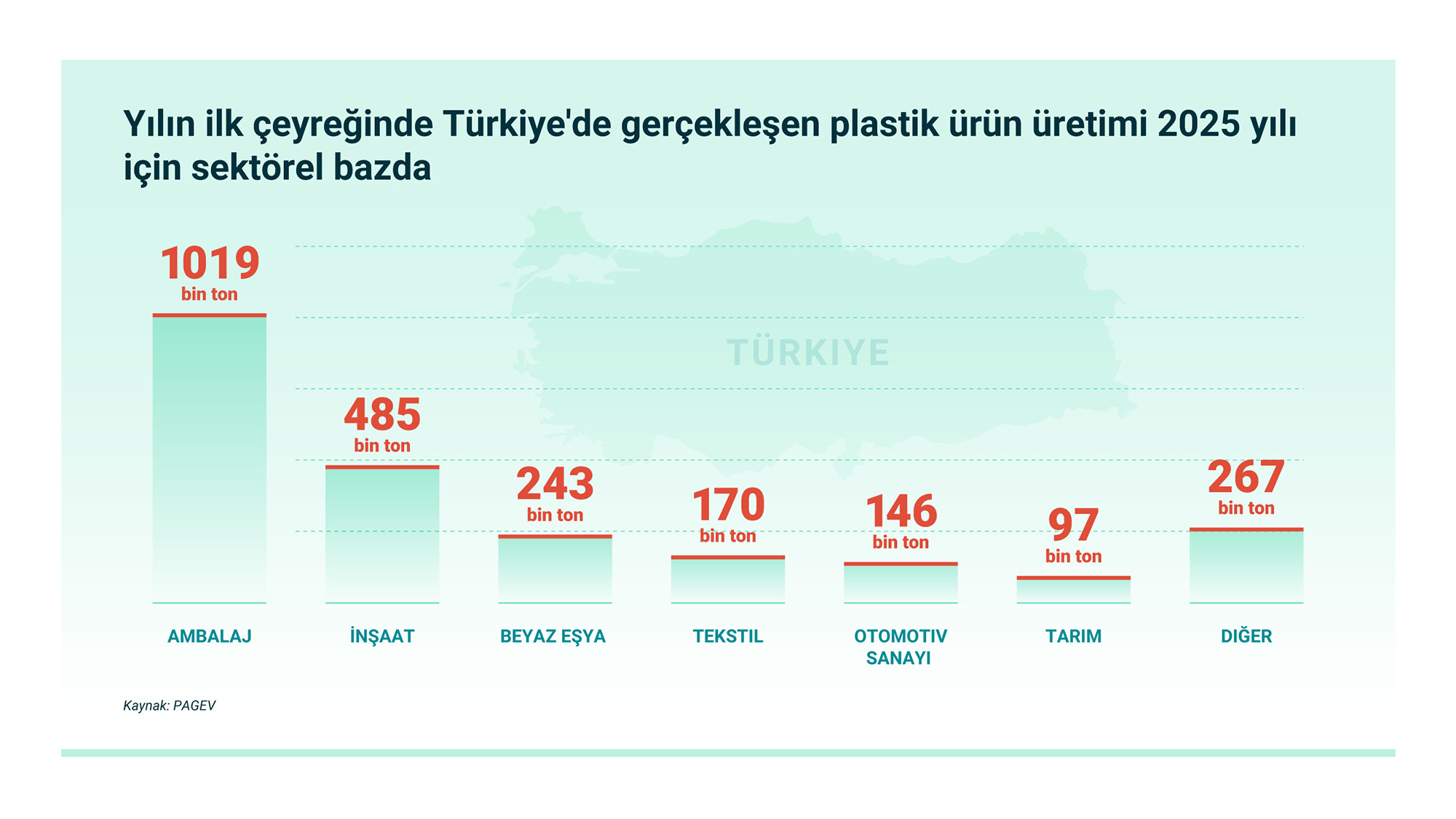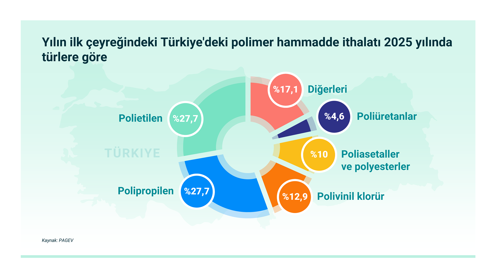 PAGEV (Türkiye Plastik Sanayicileri Araştırma, Geliştirme ve Eğitim Vakfı) verilerine göre, 2025 yılının ilk üç ayında Türkiye’de 651 bin ton polimer hammaddesi üretildi. Bu miktarın %52’si PET (polietilen tereftalat), %15’i genleştirilmiş polistiren, %13’ü ise düşük yoğunluklu polietilen oluşturdu.