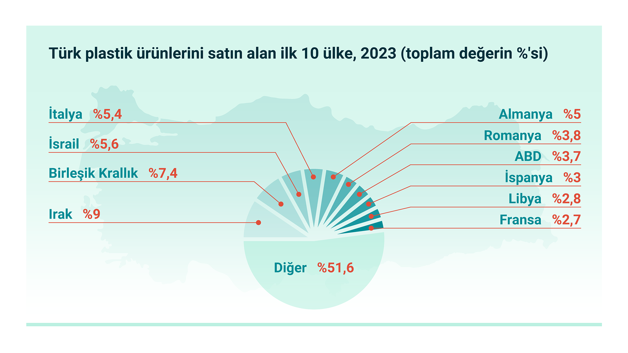 10 ülkeye yapılan sevkiyatlar, toplam ihracatın ton bazında %46, para bazında ise %49 oluşturdu. Yıl boyunca Irak, İngiltere, İsrail, İtalya ve Almanya Türk plastik ürünlerinin en çok ihraç edildiği ülkeler oldu.