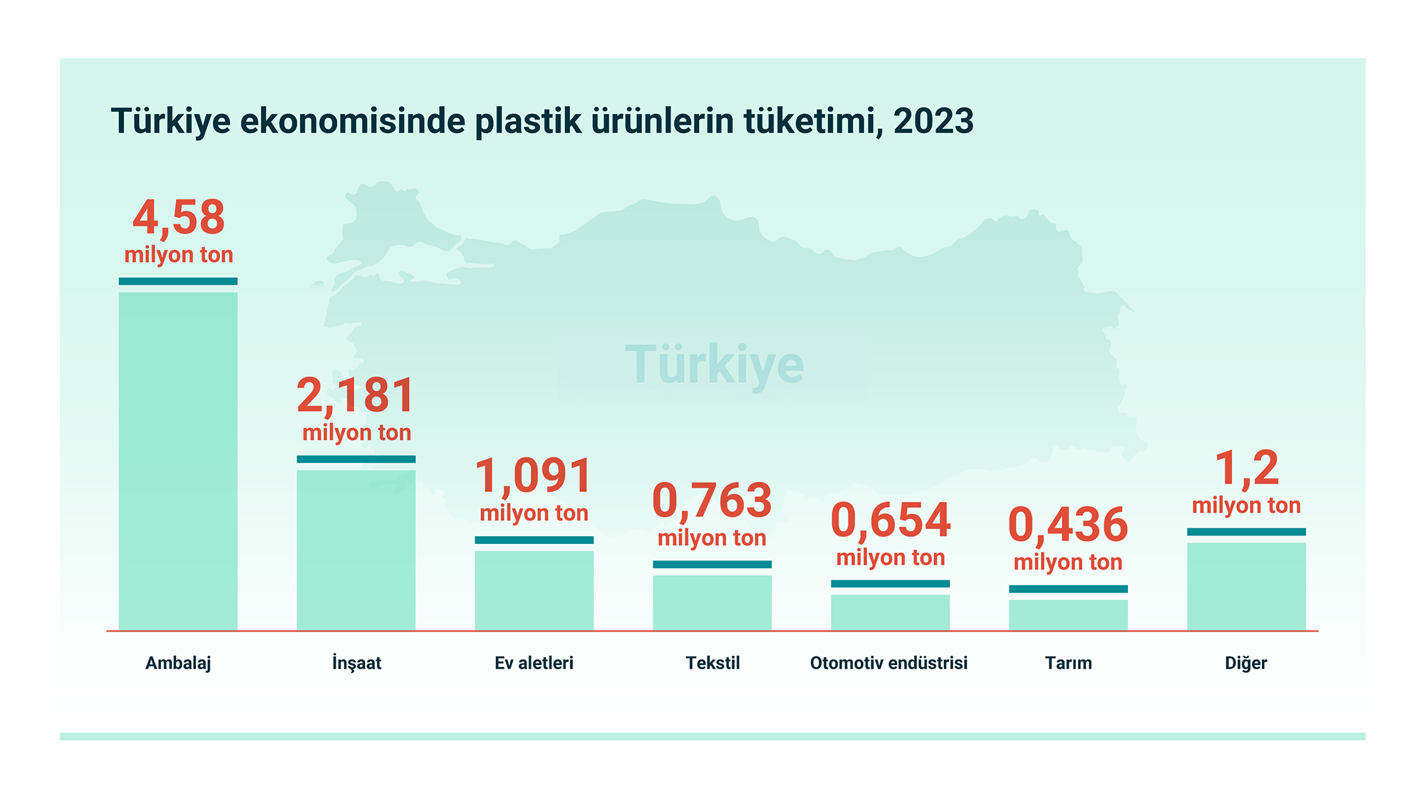 2023 yılında satılan 9,1 milyon ton plastik ürün iç tüketiminin yaklaşık 4,5 milyon tonu otomotiv, ambalaj, inşaat ve elektronik gibi ihracat sektörleri kanalıyla yarı mamul ve mamul şeklinde dolaylı olarak ihraç edildi. Kalan 4,6 milyon ton ise nihai ürün olarak tüketilmiştir.