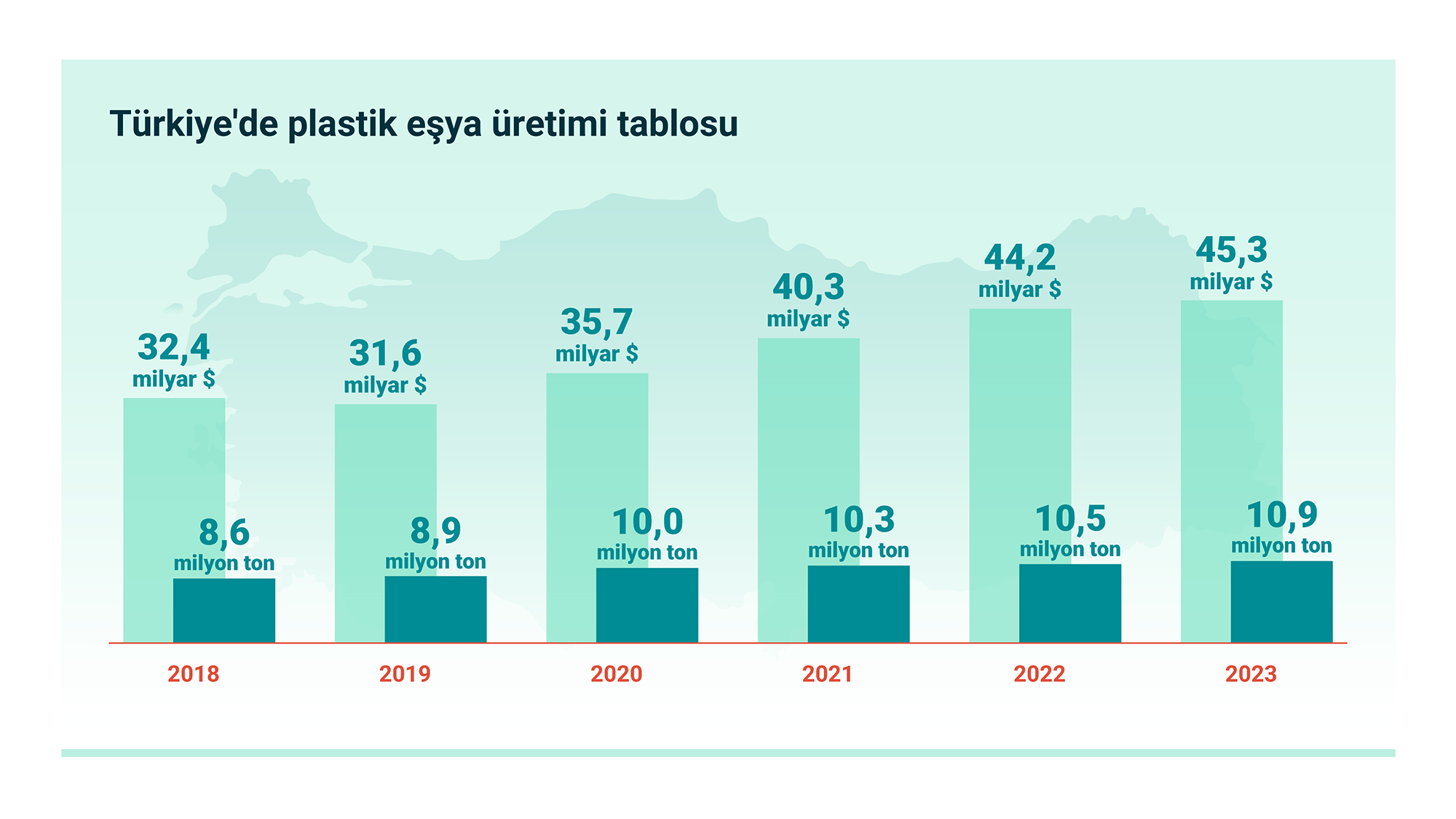 PAGEV, ülkedeki plastik ürün üretiminin hacim ve değer bakımından geçen yıl tarihi bir rekor seviyeye ulaştığını belirtiyor. Toplam üretimde plastik ambalaj malzemeleri başı çekerken (4,58 milyon ton), muhtelif yapı malzemeleri ikinci sırada yer aldı (2,18 milyon ton).