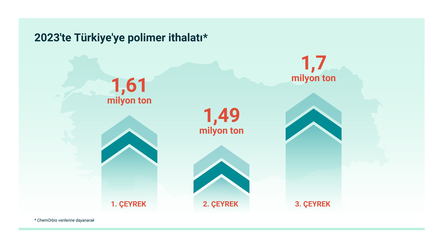 Üçüncü çeyrek boyunca Türkiye, (süspansiyon ve emülsiyon türleri dahil olmak üzere) yaklaşık 275 bin ton PVC ithal etti. Bu rakam, 2. çeyreğe kıyasla %36, geçen yılın 3. çeyreğine kıyasla ise %50 artış kaydetti. ChemOrbis, bunun bu çeyrekteki en büyük PVC ithalatı hacmi olduğunu vurguluyor.